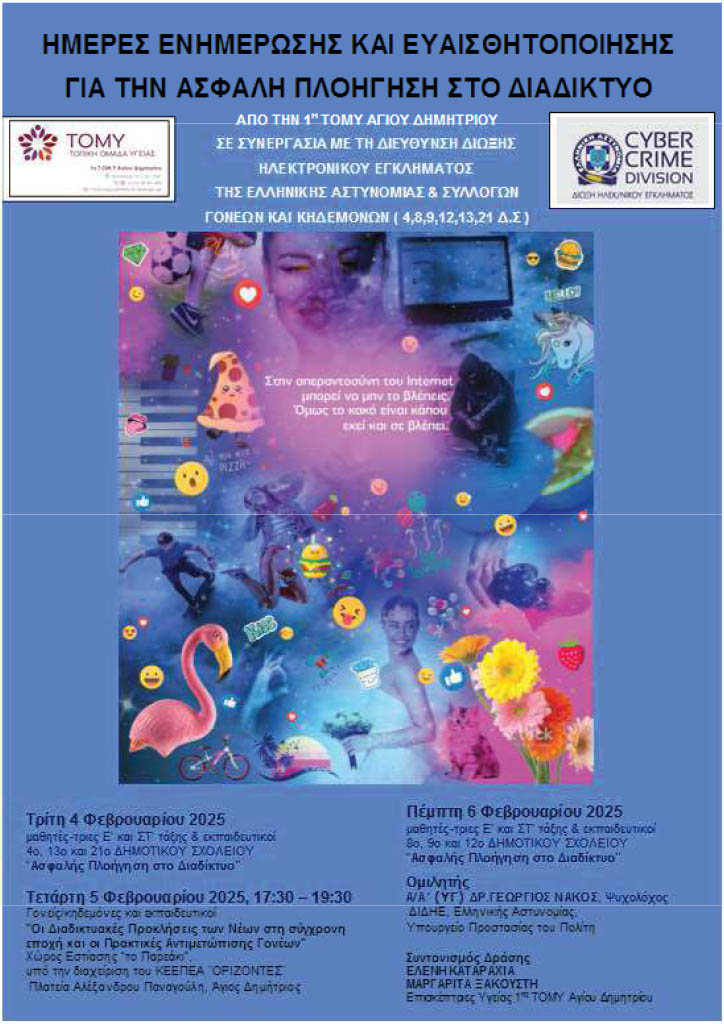 Συγκεκριμένα, η Διεπιστημονική Ομάδα της 1ης ΤΟΜΥ Αγίου Δημητρίου σε συνεργασία με την Διεύθυνση Δίωξης Ηλεκτρονικούς Εγκλήματος της Ελληνικής Αστυνομίας και τους Συλλόγους Γονέων και Κηδεμόνων των Δημοτικών Σχολείων (4ου, 8ου, 9ου,12ου, 13ου και 21ου) του Δήμου διοργανώνουν εκδήλωση με θέμα: «Οι διαδικτυακές προκλήσεις των νέων στη σύγχρονη εποχή και οι πρακτικές αντιμετώπισης γονέων».