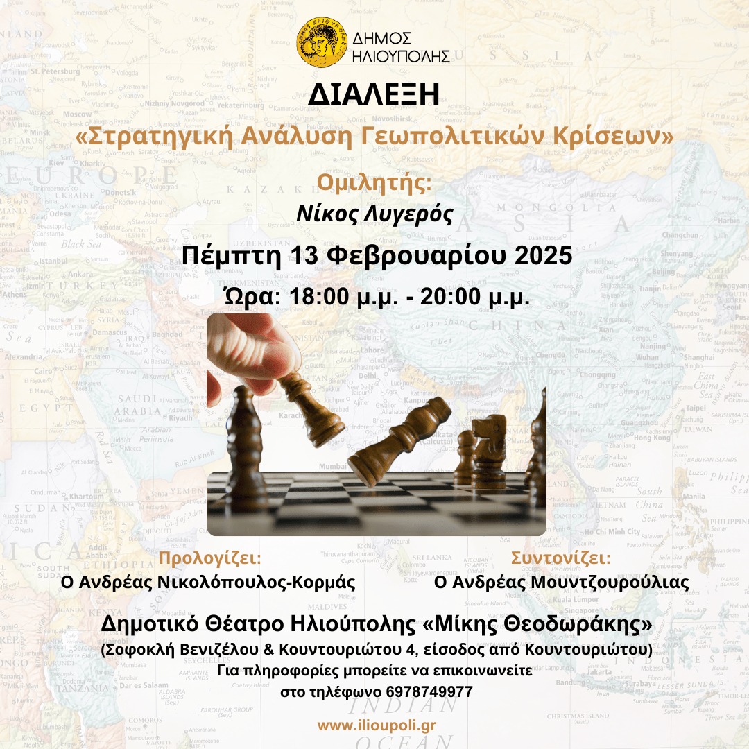 Ο Δήμος Ηλιούπολης έχει την τιμή να προσκαλέσει τους πολίτες σε μία διάλεξη με τίτλο «Στρατηγική Ανάλυση Γεωπολιτικών Κρίσεων» με ομιλητή τον Στρατηγικό Σύμβουλο κ. Νίκο Λυγερό.