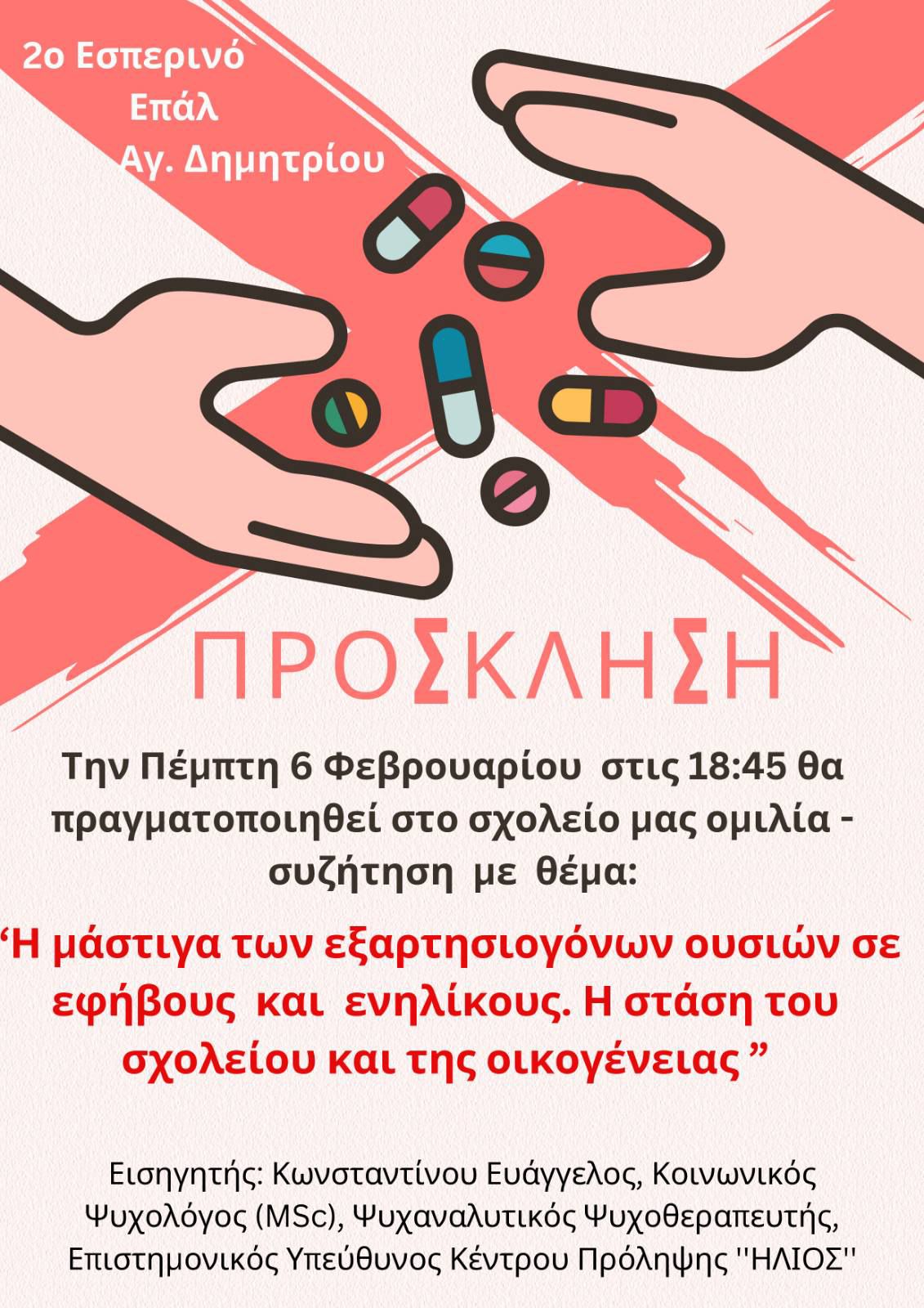 Εισηγητής: Κωνσταντίνου Ευάγγελος, Κοινωνικός Ψυχολόγος (MSc), Ψυχαναλυτικός Ψυχοθεραπευτής, Επιστημονικός Υπεύθυνος Κέντρου Πρόληψης ΗΛΙΟΣ