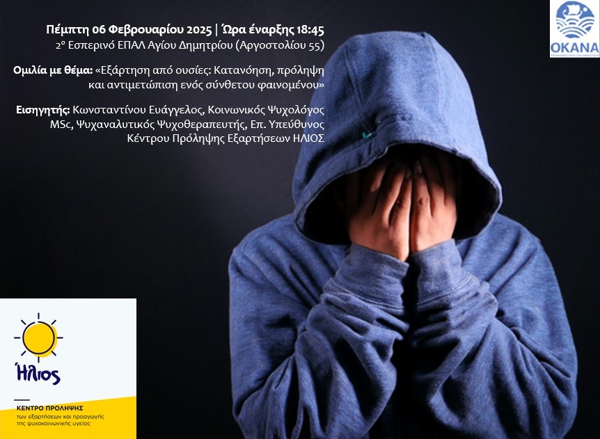 Το Κέντρο Πρόληψης των Εξαρτήσεων και Προαγωγής της Ψυχοκοινωνικής Υγείας «ΗΛΙΟΣ» διοργανώνει ομιλία και συζήτηση με θέμα: «Εξάρτηση από ουσίες: Κατανόηση, πρόληψη και αντιμετώπιση ενός σύνθετου φαινομένου».