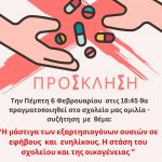 Στη συνάντηση αυτή με μαθητές και παιδαγωγούς, θα επιχειρηθεί να κατανοηθεί το φαινόμενο του εθισμού από ουσίες στις πολλαπλές του διαστάσεις, εστιάζοντας στον κρίσιμο ρόλο του περιβάλλοντος (οικογενειακού, σχολικού, ευρύτερα κοινωνικού) στην αντιμετώπιση και την πρόληψη του.