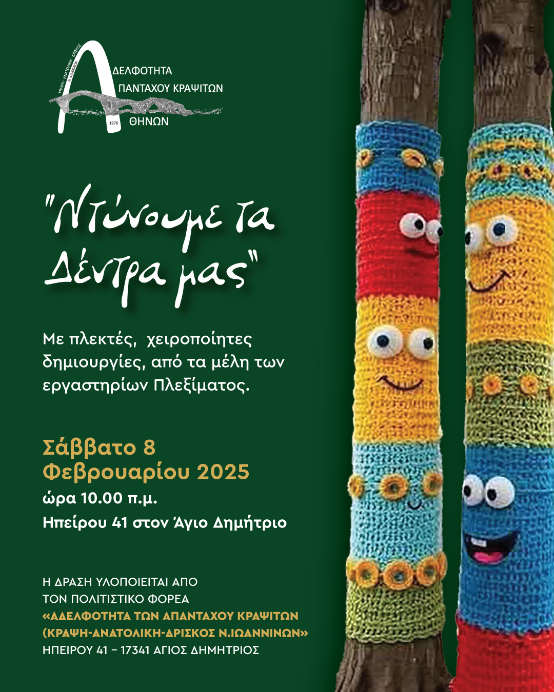 Το Σάββατο 8 Φεβρουαρίου 2025 και ώρα 10:00 το πρωί, στην Οδό Ηπείρου 41, έξω από την Στέγη Κραψιτών, «Ντύνουμε τα δέντρα μας» με πλεκτές, χειροποίητες δημιουργίες, από τα μέλη των εργαστηρίων Πλεξίματος. Πρόκειται για μια μικρή εικαστική παρέμβαση, που θα δώσει μία ευχάριστη νότα σε ένα δρόμο της Πόλης, που καθημερινά διασχίζεται από παιδιά, από το 6ο Δημοτικό Σχολείο & το 10ο Νηπιαγωγείο.