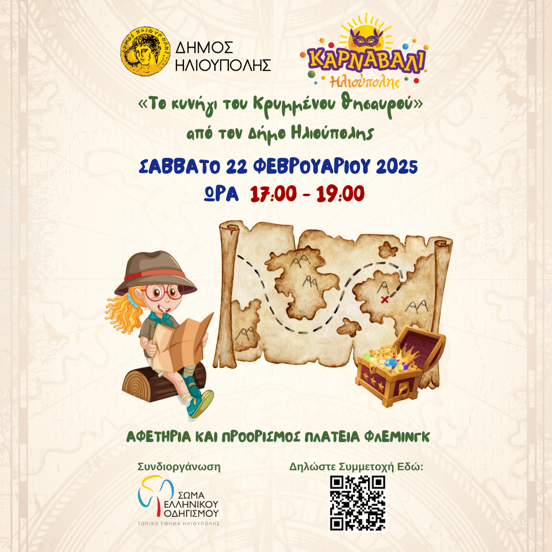 O Δήμος Ηλιούπολης και το Σώμα Ελληνικού Οδηγισμού Τ.Τ. Ηλιούπολης διοργανώνουν ένα «Κυνήγι Κρυμμένου Θησαυρού» με αφετηρία και τελικό προορισμό την Πλατεία Φλέμινγκ.