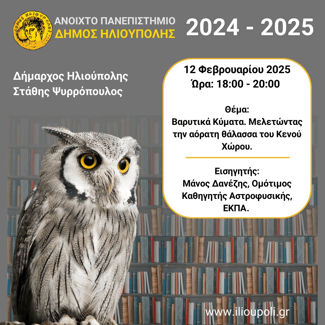 Το Ανοιχτό Πανεπιστήμιο Ηλιούπολης συνεχίζει δυναμικά με την 12η ομιλία του Ανοιχτού Πανεπιστημίου την Τετάρτη 12 Φεβρουαρίου 2025, και ώρα 18:00 – 20:00, με εισηγητή τον Μάνο Δανέζη, Ομότιμο Καθηγητή Αστροφυσικής, ΕΚΠΑ και θέμα: «Βαρυτικά Κύματα. Μελετώντας την αόρατη θάλασσα του Κενού Χώρου».