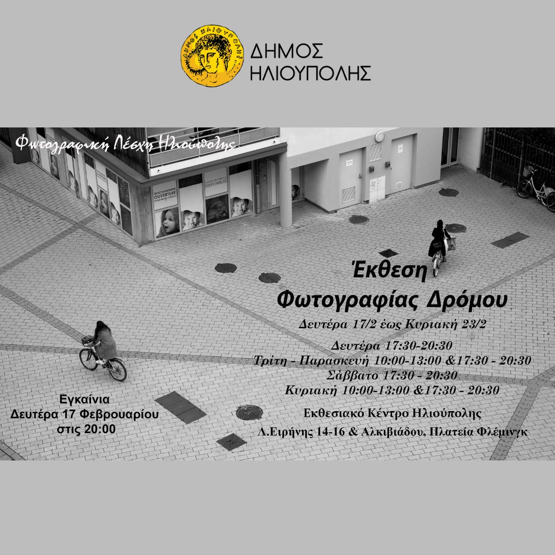 H Φωτογραφικής Λέσχης Ηλιούπολης παρουσιάζει μια έκθεση φωτογραφίας που προβάλει την καθημερινότητα με μία άλλη οπτική, με τίτλο «Φωτογραφία Δρόμου», στο Εκθεσιακό Κέντρο Δήμου Ηλιούπολης από τις 17 έως 23 Φεβρουαρίου 2025.