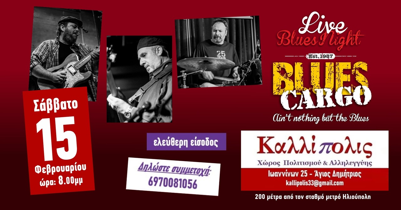 Mία αξέχαστη ξεχωριστή βραδιά με τους BLUES CARGO, την πιο αυθεντική Chicago Blues Band της Ελληνικής σκηνής που είναι ενεργή από το 1987, θα απολαύσουν όσοι παρευρεθούν στον φιλόξενο Χώρο Πολιτισμού & Αλληλεγγύης «Καλλίπολις», το Σάββατο 15 Φεβρουαρίου, ώρα 8.00 μ.μ..