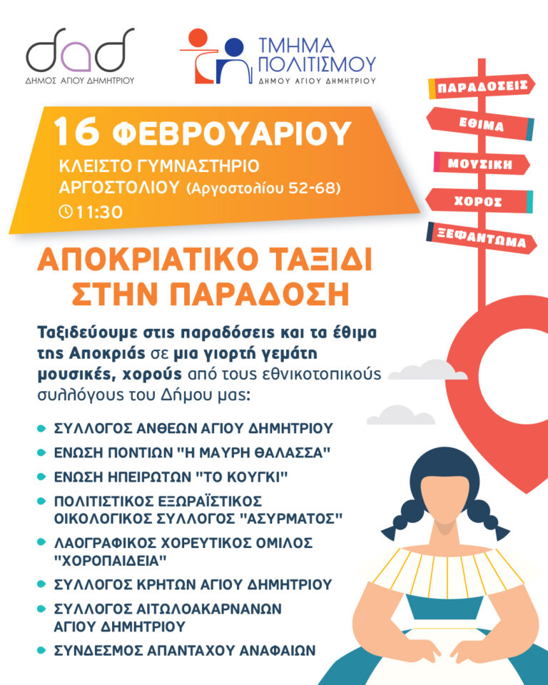 Οι αποκριάτικες εκδηλώσεις αρχίζουν λοιπόν, την ερχόμενη Κυριακή 16 Φεβρουαρίου 2025 με ένα «Αποκριάτικο Ταξίδι την Παράδοση» στο Κλειστό Γυμναστήριο Αργοστολίου (Αργοστολίου 52- 68) και ώρα 11:30 π.μ.. Η εκδήλωση είχε προγραμματιστεί, αρχικά, για το Πάρκο Ελ. Βενιζέλου (Ασύρματος) αλλά άλλαξε, λόγω των προβλέψεων της ΕΜΥ για έντονα καιρικά φαινόμενα την ημέρα διεξαγωγής της.