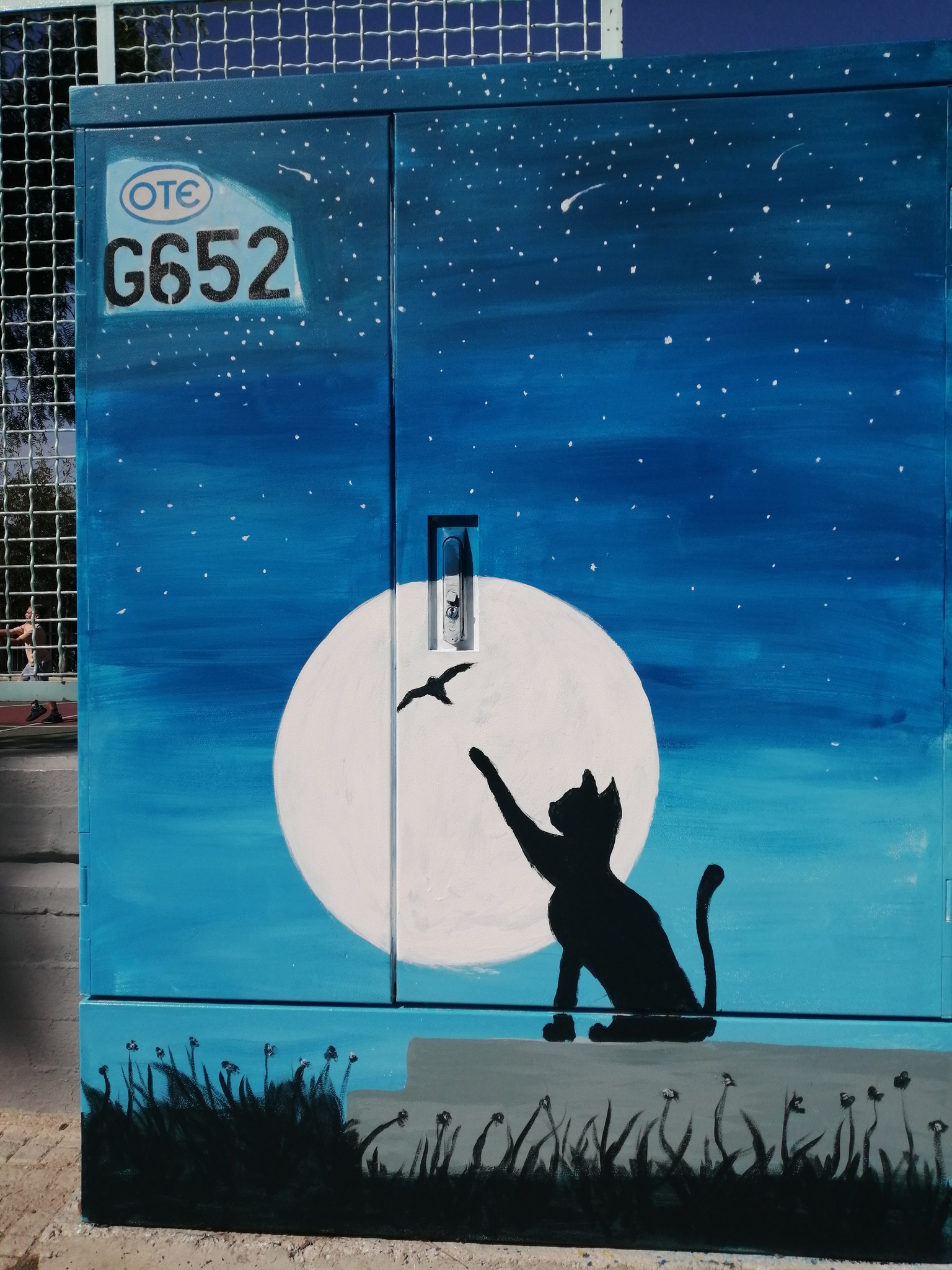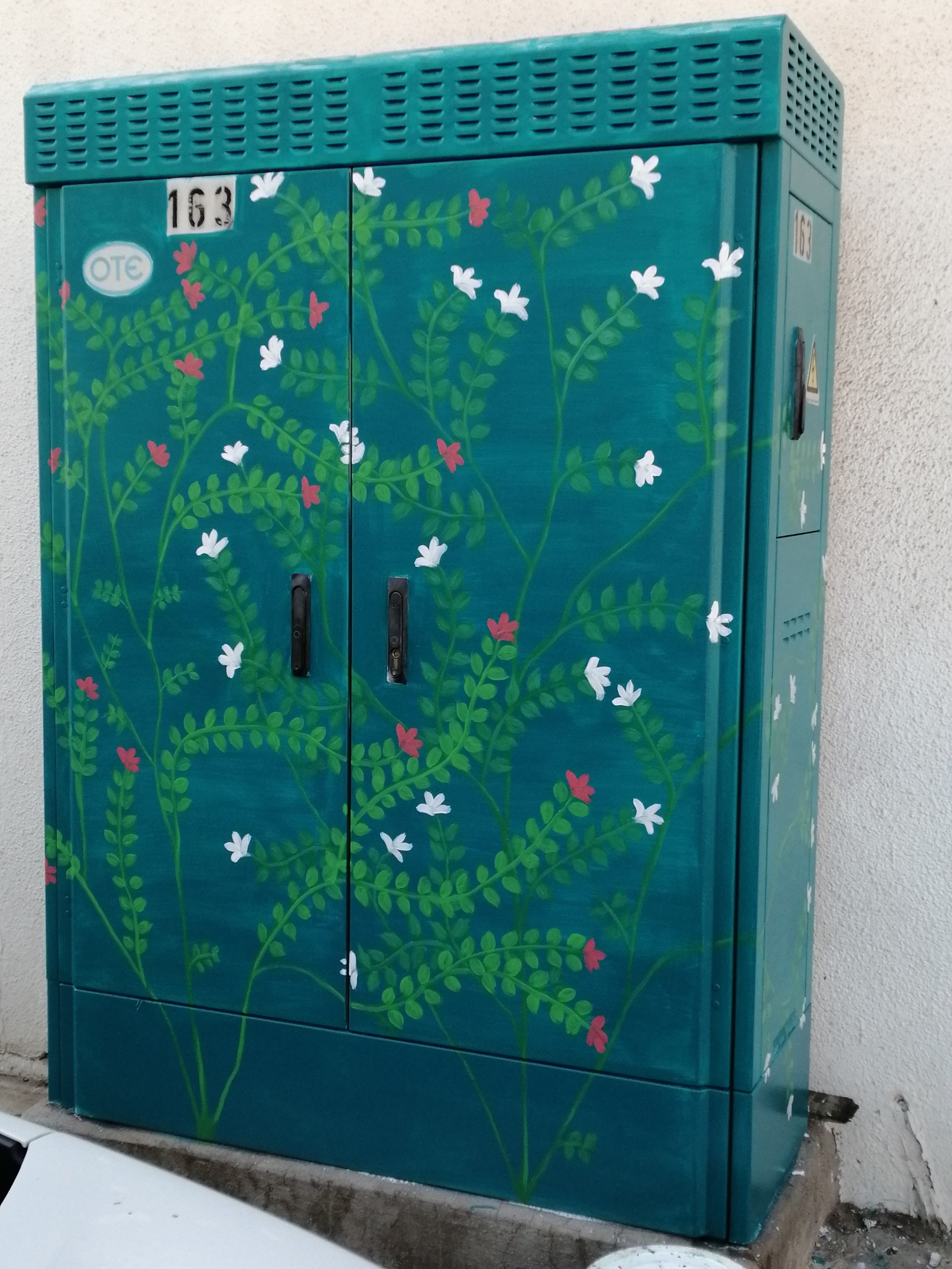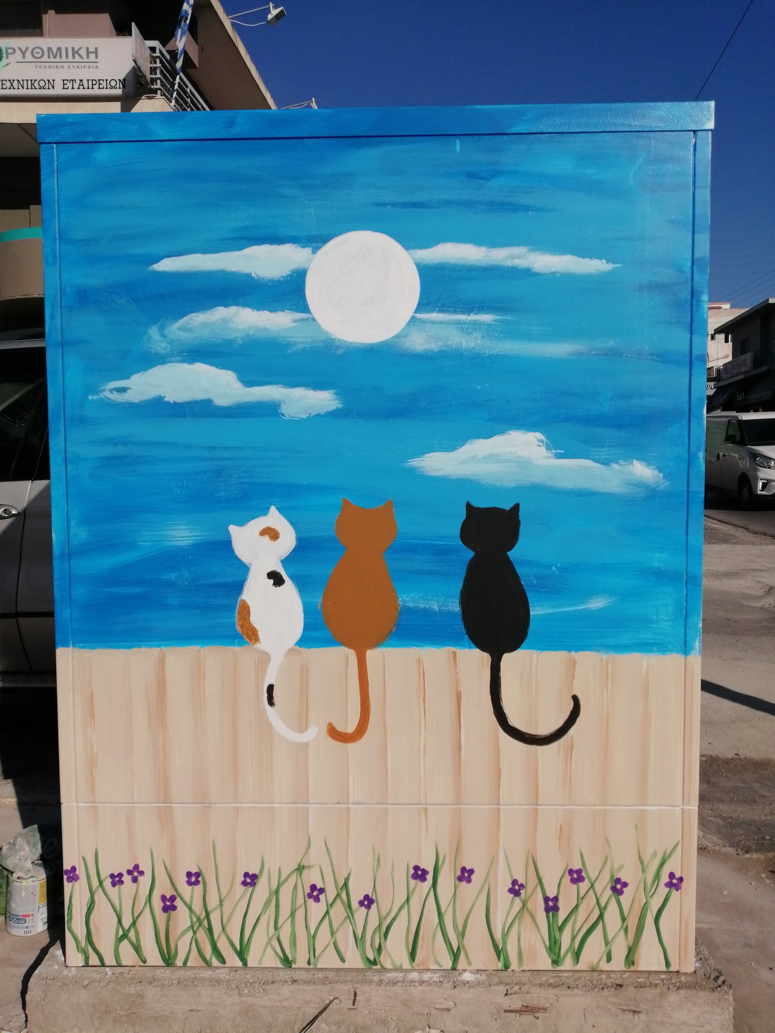 Η Ειρήνη εργάζεται στο Μικρό Συνεργείο της Τεχνική Υπηρεσίας και παράλληλα είναι ερασιτέχνης της ζωγραφικής. Με την παρότρυνση και ενθάρρυνση του δημάρχου Στέλιου Μαμαλάκη, του εντεταλμένου συμβούλου Ευάγγελου Μαλαθούνη και τη στήριξη του υπεύθυνου του Μικρού Συνεργείου Μάκη Κόκκινου, των συναδέλφων και της υπηρεσίας, που καλύπτει το κόστος των εικαστικών παρεμβάσεων, ζωγραφίζει όμορφες εικόνες στα ΚΑΦΑΟ του ΟΤΕ, δίνοντας μια χαρούμενη καλλιτεχνική πινελιά στους δρόμους και τις γειτονιές τις πόλης.