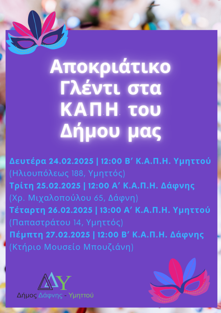 Ο Δήμαρχος Δάφνης-Υμηττού, Νικόλαος Τσιλίφης, και το Τμήμα Κοινωνικής Πολιτικής διοργανώνουν αποκριάτικο γλέντι για τα μέλη των Κ.Α.Π.Η. του Δήμου.