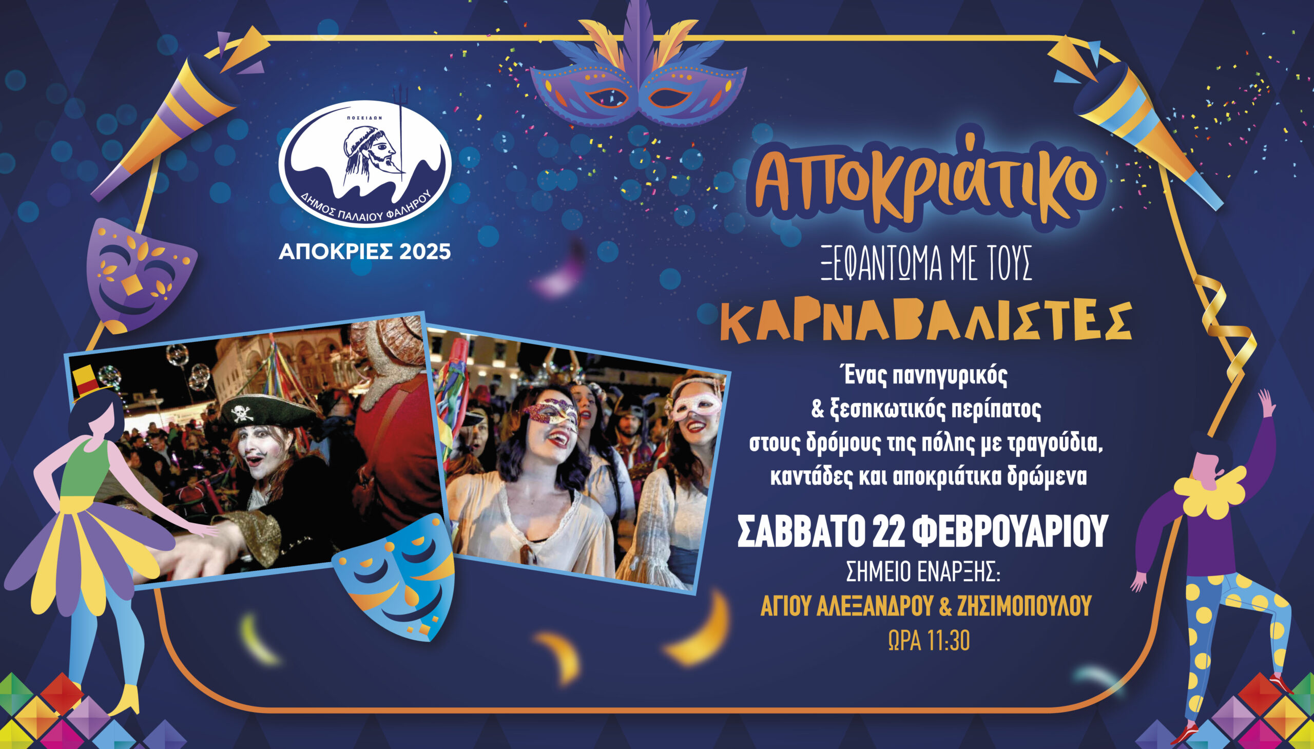 Ο Δήμαρχος Παλαιού Φαλήρου Γιάννης Φωστηρόπουλος, προσκαλεί όλους τους πολίτες, το Σάββατο 22 Φεβρουαρίου, στην Αποκριάτικη δράση «Καρναβαλιστές» με σημείο έναρξης τη συμβολή των οδών Αγίου Αλεξάνδρου και Ζησιμοπούλου και ώρα 11:30 το πρωί.