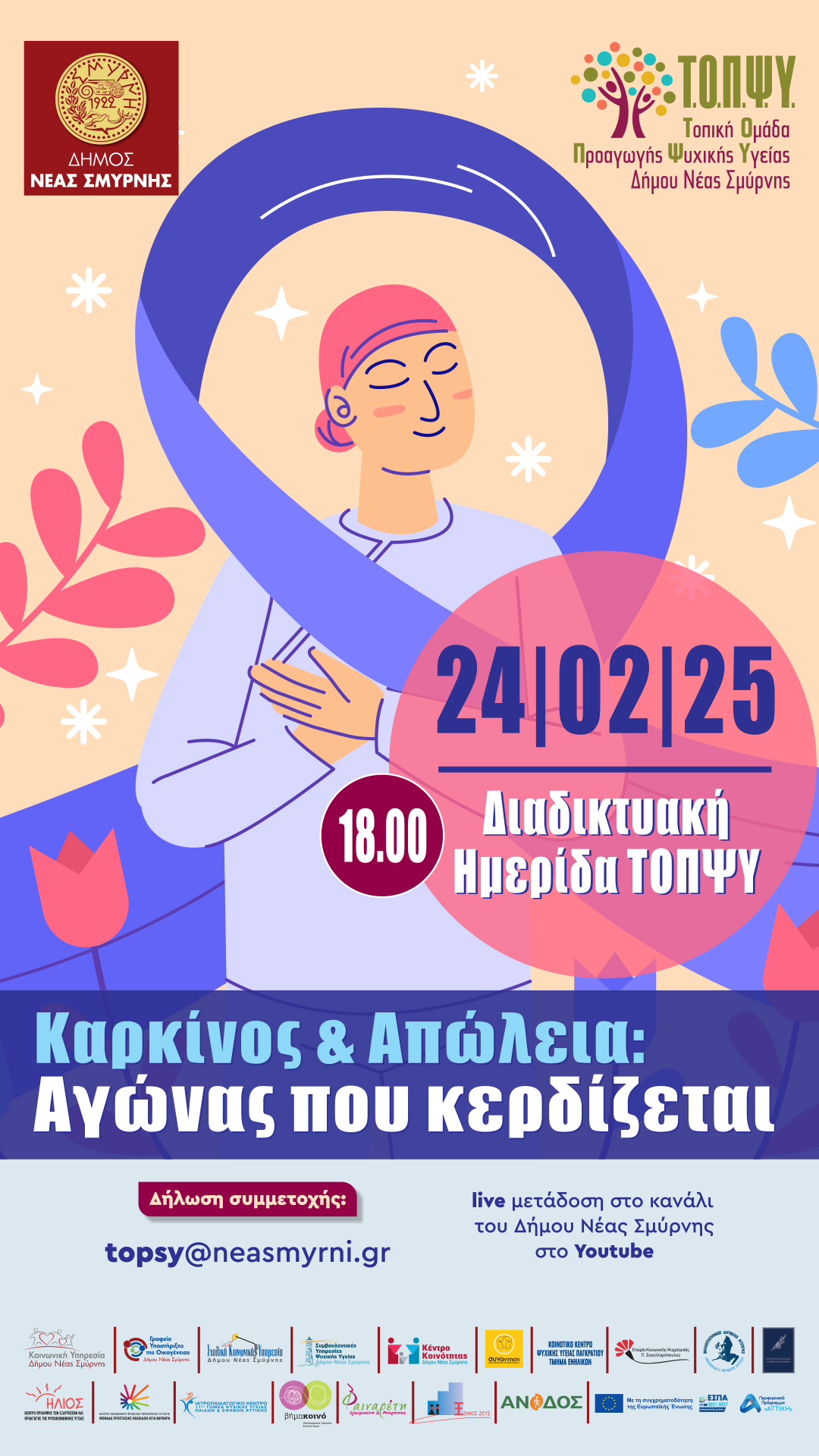«Καρκίνος & Απώλεια: Αγώνας που κερδίζεται» είναι το θέμα της διαδικτυακής ημερίδας που διοργανώνει η Τοπική Ομάδα Προαγωγής Ψυχικής Υγείας (ΤΟΠΨΥ) του Δήμου Νέας Σμύρνης την Δευτέρα 24 Φεβρουαρίου και ώρα 18:00.