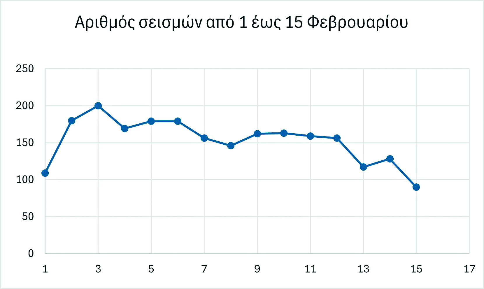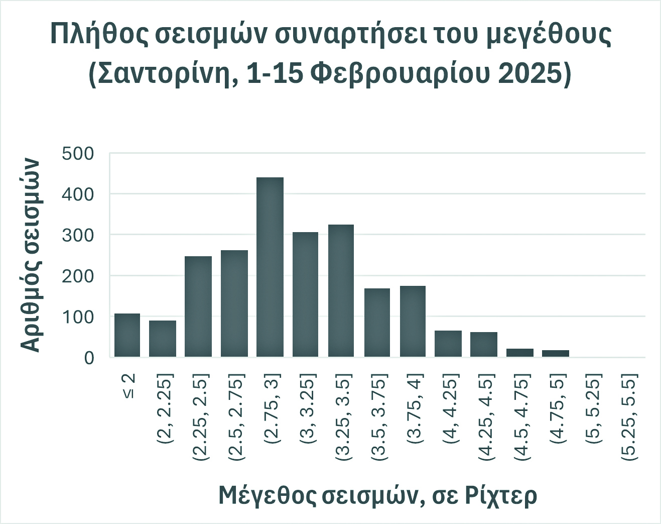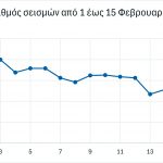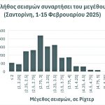 Στην επόμενη Εικόνα 3 προβάλλεται ιστόγραμμα του μεγέθους των σεισμών και στην Εικόνα 4 η χρονική εξέλιξη του μεγέθους στη διάρκεια των δεκαπέντε ημερών. Τις τρεις πρώτες ημέρες το φαινόμενο ξεκινάει με μικρότερα μεγέθη και το ίδιο συμβαίνει και στις τρεις τελευταίες ημέρες στο διάγραμμα, 13 έως 15 Φεβρουαρίου. Παρόμοιο είναι και το διάγραμμα στην Εικόνα 5, στο οποίο προβάλλεται ο αριθμός των σεισμών ανά ημέρα.