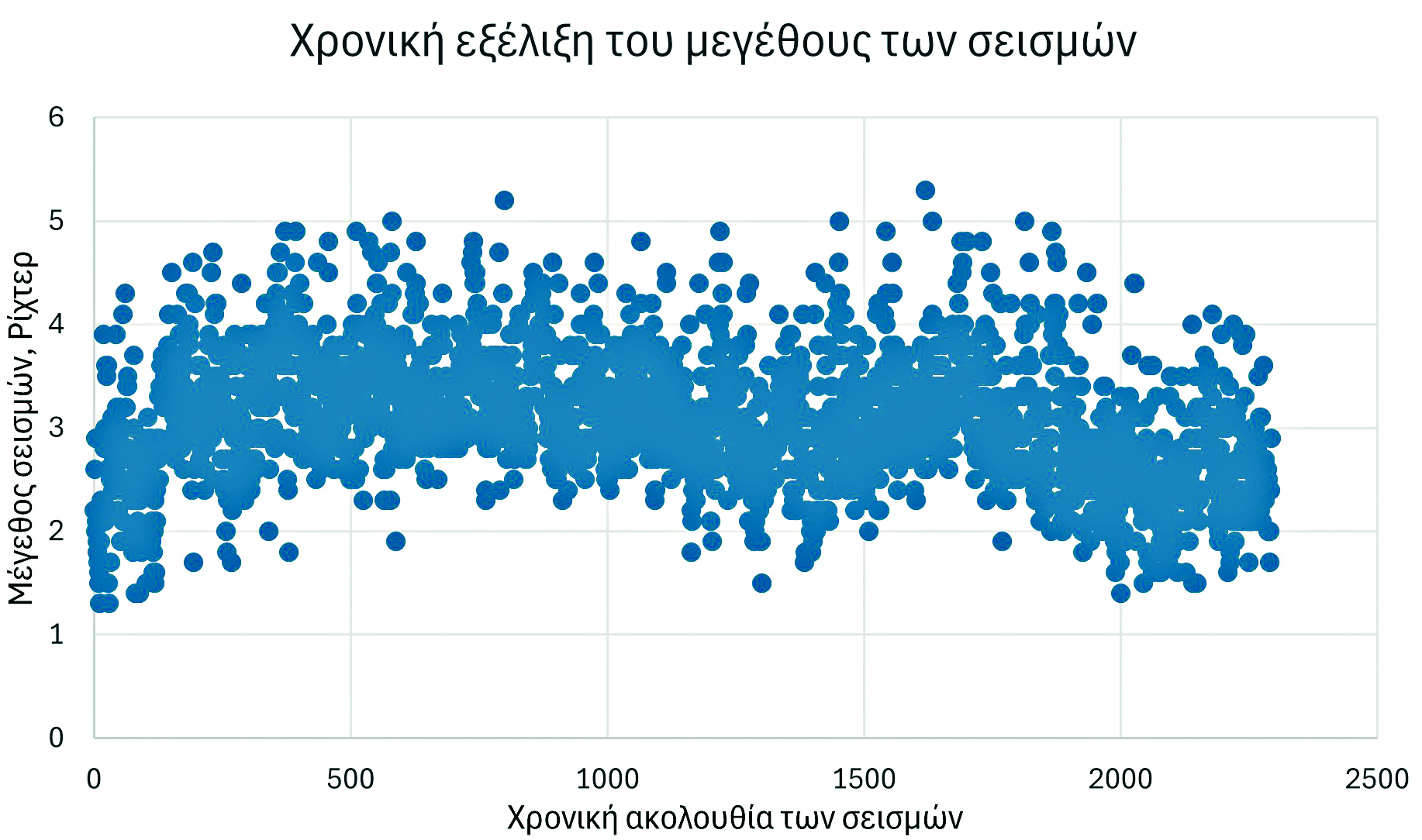 Η ανησυχία από την αύξηση του μεγέθους των σεισμών από 3.5 σε 4 ή 5 ή 5.3 είναι δικαιολογημένη ψυχολογικά, αλλά αυτό που μετράει από πλευράς επικινδυνότητας. είναι η ενέργεια που εκλύεται από τους σεισμούς και η διαφορά από 4 σε 5, δεν είναι ιδιαίτερα σημαντική. H κλίμακα Ρίχτερ είναι λογαριθμική του εύρους της ταλάντωσης που καταγράφεται στον σεισμογράφο. Δηλαδή ένας σεισμός 6 Ρίχτερ καταγράφεται στον σεισμογράφο με ταλάντωση δεκαπλάσιου εύρους από ένα πεντάρη σεισμό. Η ενέργεια όμως που εκλύεται από τον σεισμό των 6 Ρίχτερ είναι 103/2, περίπου 32 φορές μεγαλύτερη. Η διαφορά μεγέθους και ενέργειας φαίνεται παραστατικά στην Εικόνα 6.