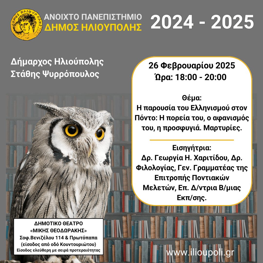 Το Ανοιχτό Πανεπιστήμιο Ηλιούπολης συνεχίζει δυναμικά με την 15η ομιλία του, με θέμα: «Η παρουσία του Ελληνισμού στον Πόντο: Η πορεία του, ο αφανισμός του, η προσφυγιά. Μαρτυρίες», με εισηγήτρια την Δρ. Γεωργία Η. Χαριτίδου, Δρ. Φιλολογίας, Γεν. Γραμματέας της Επιτροπής Ποντιακών Μελετών, Επ. Δ/ντρια Β/μιας Εκπ/σης.