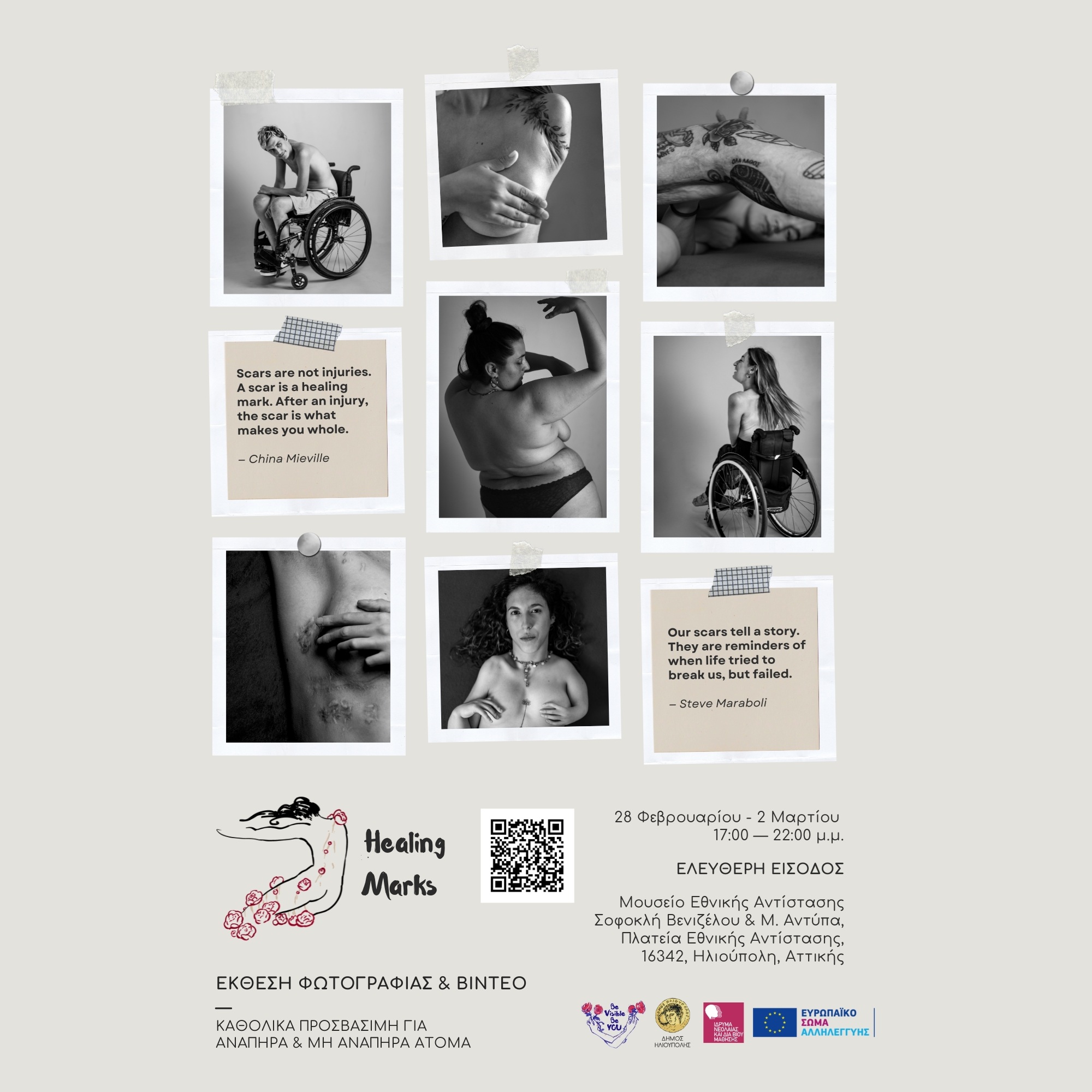 Η Έκθεση Φωτογραφιών και Βίντεο «Healing Marks» πρόκειται για μια σειρά φωτογραφιών και βίντεο για τη δύναμη της αυτοαποδοχής και την κατάρριψη στιγματιστικών προτύπων ομορφιάς”, η οποία θα φιλοξενηθεί στο Μουσείο Εθνικής Αντίστασης στην Ηλιούπολη, από τις 28 Φεβρουαρίου έως τις 2 Μαρτίου, καθημερινά από τις 17:00 έως τις 22:00, με ελεύθερη είσοδο.