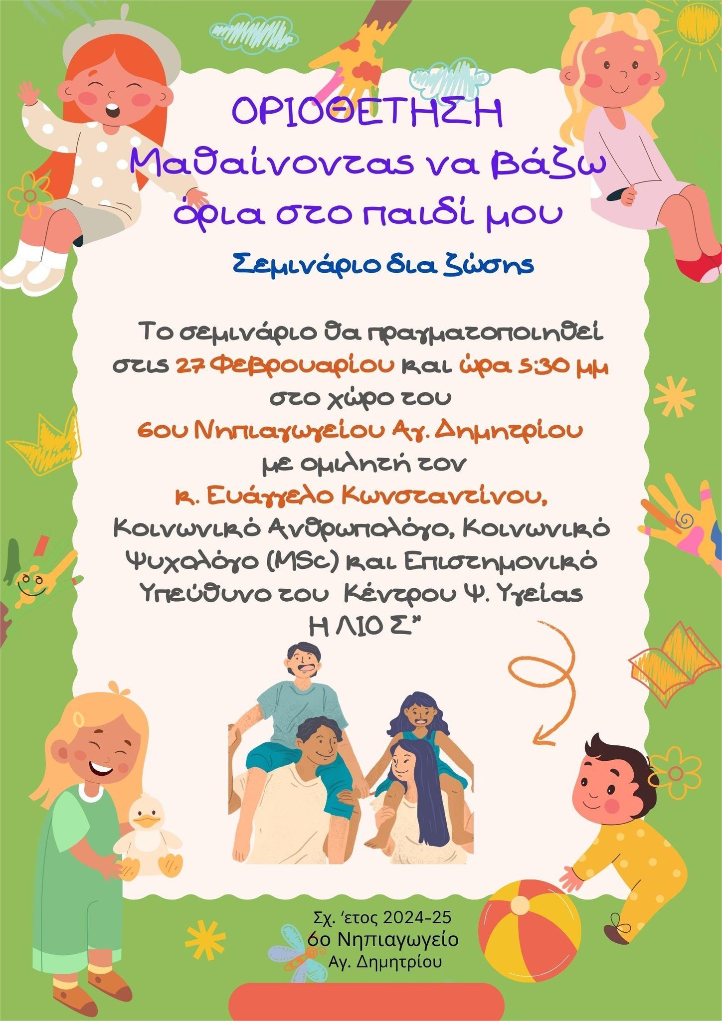 Η ομιλία θα λάβει χώρο την Πέμπτη 27 Φεβρουαρίου 2025 και ώρα 17:30, στο χώρο του 6ου Νηπιαγωγείου του Αγίου Δημητρίου (Μενελάου 74).