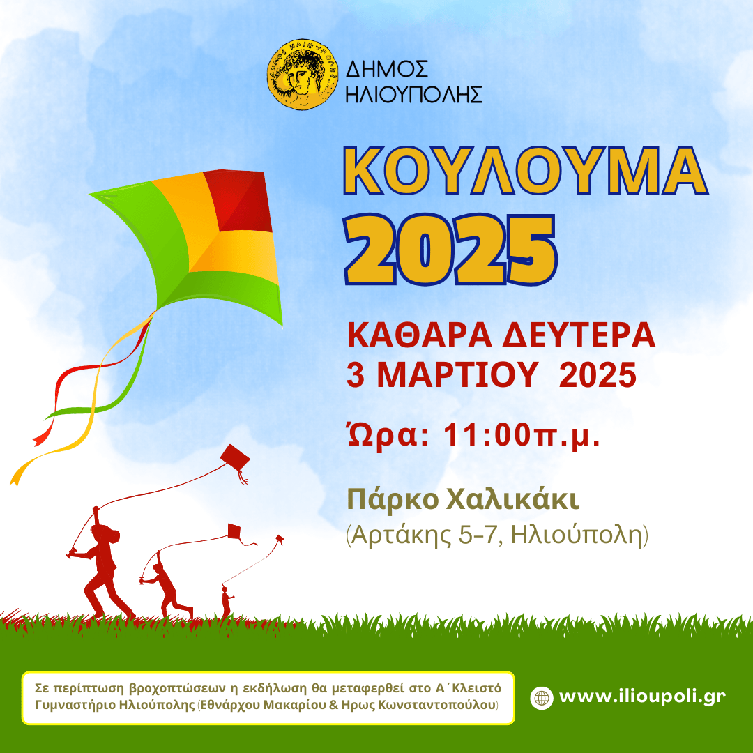 O Δήμος Ηλιούπολης τιμά τις παραδόσεις και προσκαλεί όλους τους πολίτες την Καθαρά Δευτέρα 3 Μαρτίου 2025 και ώρα 11:00 π.μ., να συμμετάσχουν στη γιορτή για τα Κούλουμα 2025, που θα λάβουν χώρα στο Πάρκο Χαλικάκι (Αρτάκης 5-7, Ηλιούπολη).