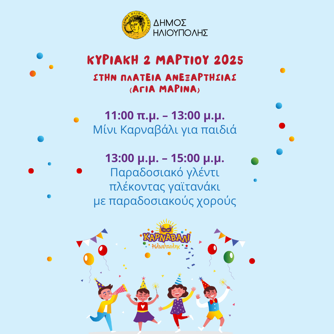 Την Κυριακή 2 Μαρτίου έρχεται και φέτος στον Δήμο Ηλιούπολης το «Μίνι καρναβάλι για παιδιά και παραδοσιακό γλέντι» που περιμένουν μικροί και μεγάλοι!