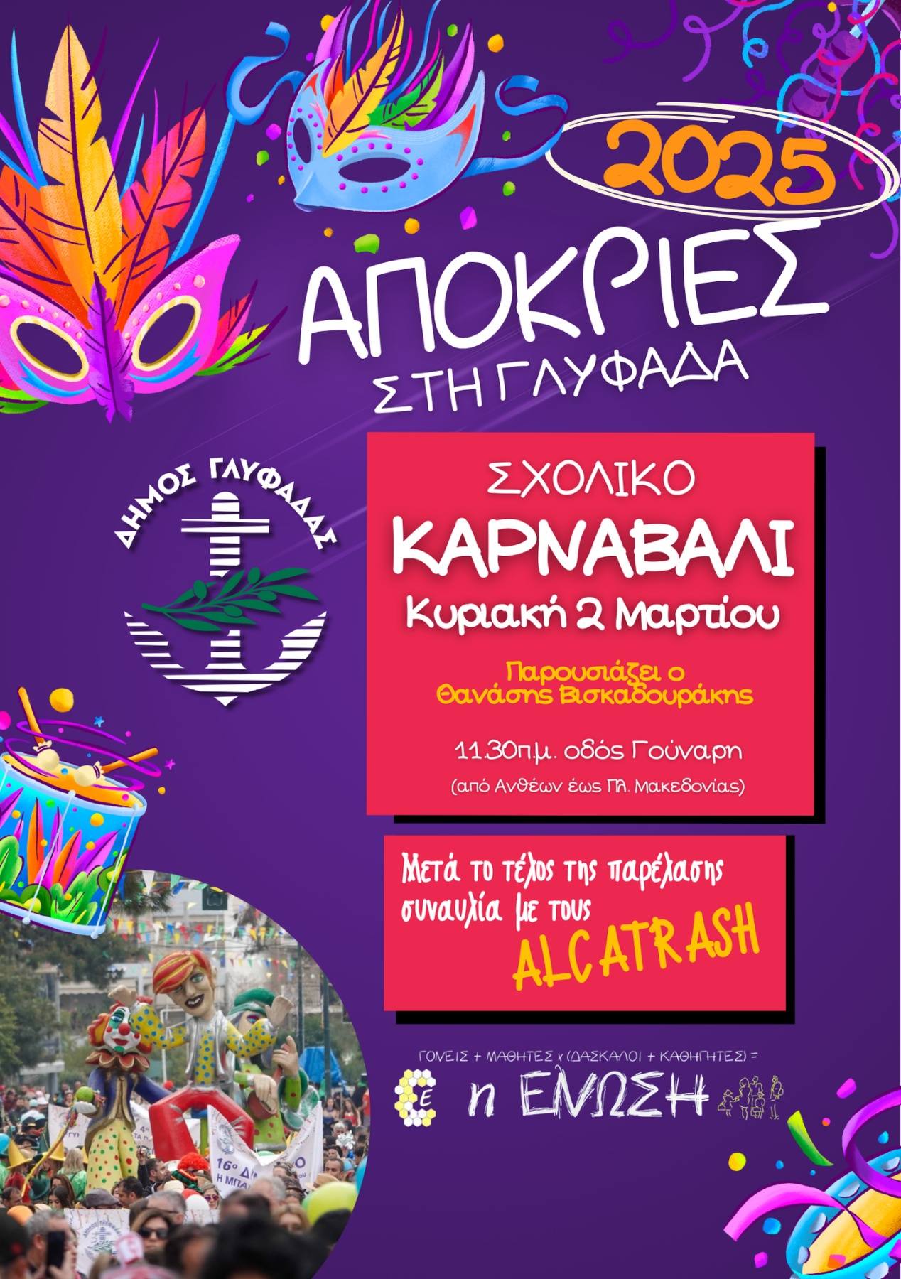Το Μαθητικό Καρναβάλι της Γλυφάδας έρχεται την Κυριακή 2 Μαρτίου με πλούσια άρματα, εμπνευσμένες στολές, κλόουν, χορευτές και πολλή μουσική και με παρουσιαστή τον μοναδικό Θανάση Βισκαδουράκη.