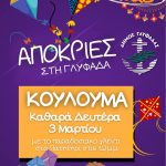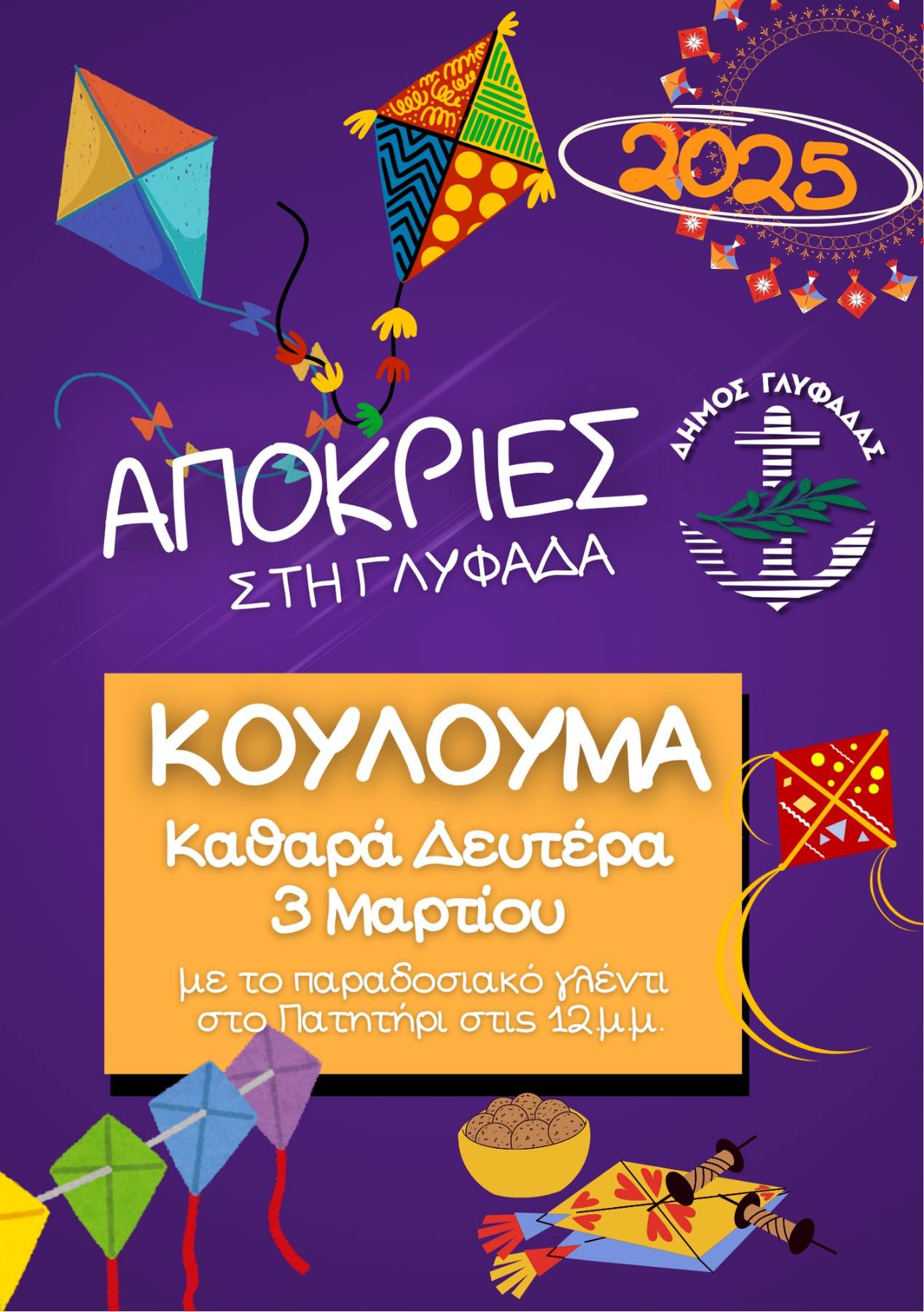 Την Καθαρά Δευτέρα, από τις 12 το μεσημέρι, θα γιορταστούν τα Κούλουμα στο «Πατητήρι» με την Κωνσταντίνα, τη Στέλλα Καρύδα και την ορχήστρα τους, με πολύ τραγούδι και χορό … με φόντο χαρταετούς και με σαρακοστιανά εδέσματα που θα διανείμει και φέτος δωρεάν σε όλους ο Δήμος Γλυφάδας. Τον συντονισμό της διοργάνωσης έχουν η Αντιδήμαρχος Κοινωνικής Μέριμνας και Αλληλεγγύης Ελένη Καράχου – Σκούταρη και οι Εντεταλμένοι Δημοτικοί Σύμβουλοι Γεωργία Βαμβακερού και Σταύρος Γιακουμάκης.