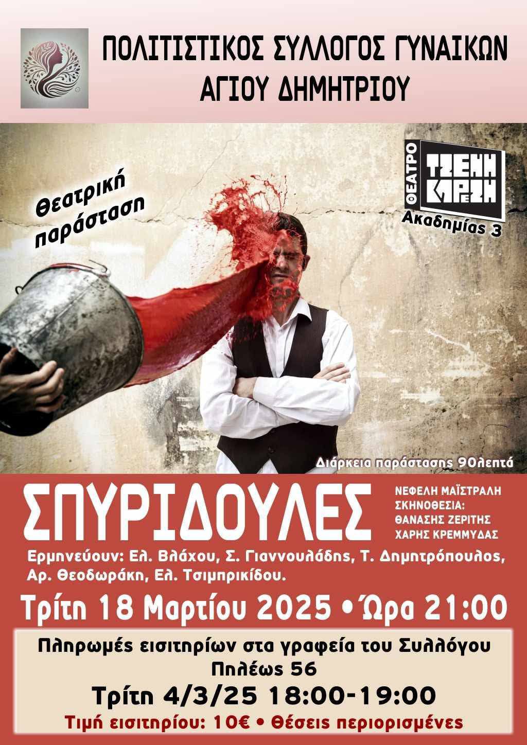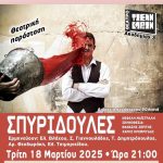 Η δεύτερη εκδήλωση είναι η θεατρική παράσταση «Οι Σπυριδούλες», που θα πραγματοποιηθεί την Τρίτη 18 Μαρτίου και ώρα 21:00, στο Θέατρο Τζένη Καρέζη.