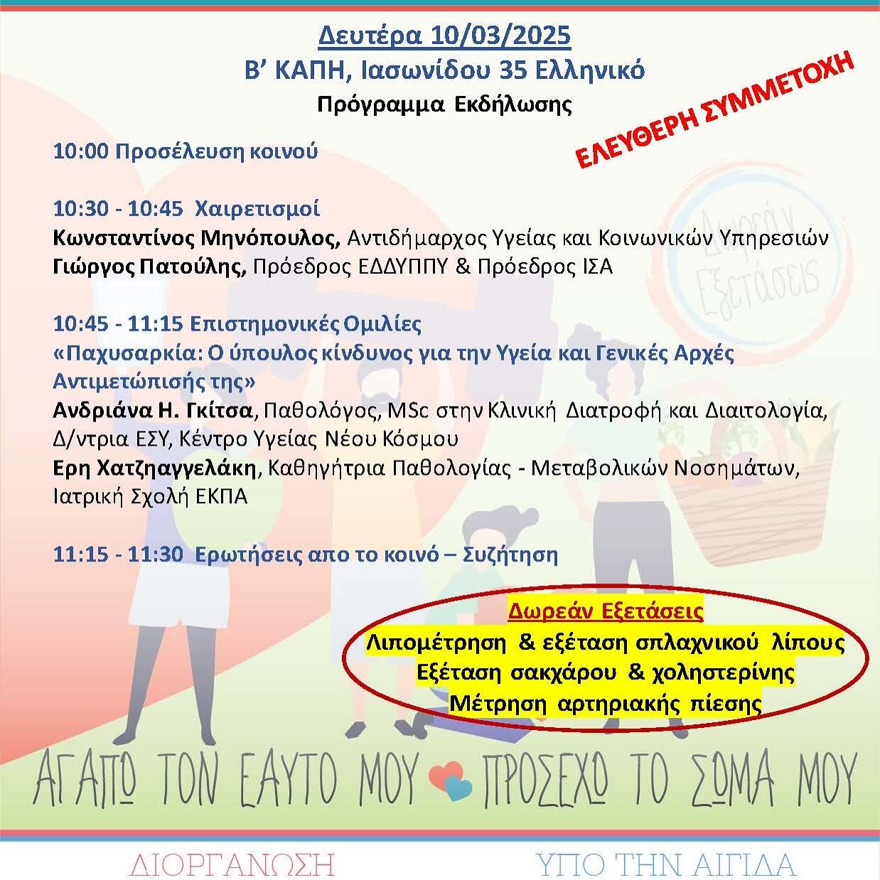 Στο Δήμο Ελληνικού-Αργυρούπολης θα υλοποιηθούν την Δευτέρα 10 Μαρτίου 2025 στην αίθουσα του Β΄ Κ.Α.Π.Η (Ιασωνίδου 35, Ελληνικό) & την Τρίτη 11 Μαρτίου 2025 στην αίθουσα του Α΄ Κ.Α.Π.Η. (Αλεξιουπόλεως 27, Αργυρούπολη) από 10:00 έως 14:00 εκδηλώσεις που θα περιλαμβάνουν ενημερωτικές ομιλίες με θέμα την παχυσαρκία και τις γενικές αρχές αντιμετώπισης της ενώ θα παρέχονται συμβουλές σχετικά με την υγιεινή διατροφή χώρους και την σωματική άσκηση από διατροφολόγους και γυμναστές που θα βρίσκονται στους χώρους.