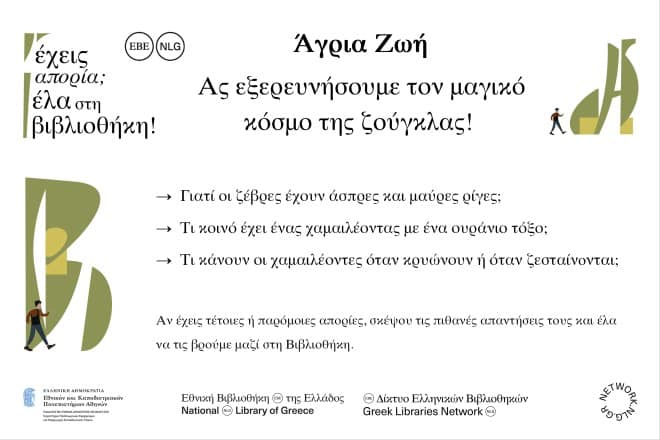 Η Δανειστική Συλλογή της Εθνικής Βιβλιοθήκης της Ελλάδος (ΕΒΕ) συμμετέχει στο πρόγραμμα του Δικτύου Ελληνικών Βιβλιοθηκών (ΔΕΒ) «Έχεις απορία; Έλα στη Βιβλιοθήκη!» και προσκαλεί τους μικρούς της φίλους να συμμετάσχουν στη δεύτερη δράση: «Άγρια ζωή: Ας εξερευνήσουμε τον μαγικό κόσμο της ζούγκλας!».