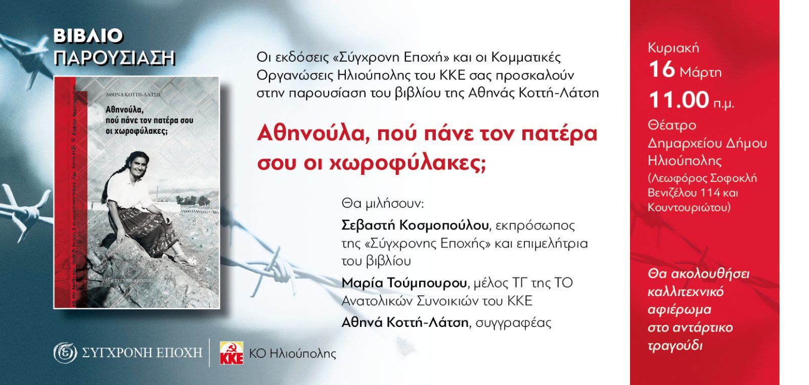 Οι εκδόσεις “Σύγχρονη Εποχή” και η οι Κομματικές Οργανώσεις Ηλιούπολης του ΚΚΕ προσκαλούν όλους τους πολίτες στην παρουσίαση του βιβλίου της Αθηνάς Κοττή-Λάτση, με τίτλο “Αθηνούλα, πού πάνε τον πατέρα σου οι χωροφύλακες;”.
