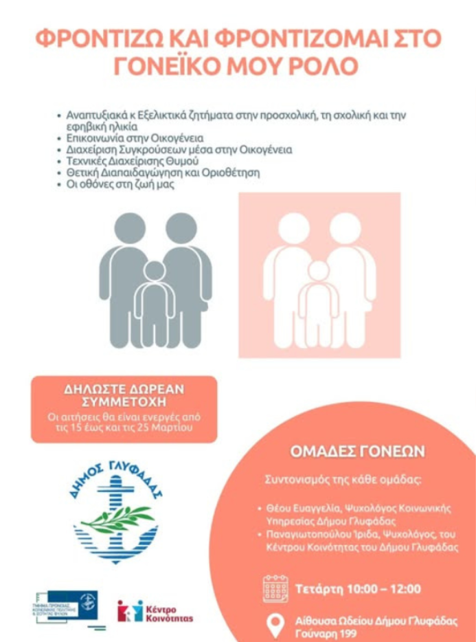Οι Ομάδες Γονέων είναι ένας ακόμα θεσμός που καθιέρωσε ο Δήμαρχος Γλυφάδας Γιώργος Παπανικολάου και αγαπήθηκε πολύ από τους δημότες. Στο πλαίσιο της ψυχοκοινωνικής υποστήριξης γονέων και οικογενειών, το Τμήμα Πρόνοιας, Κοινωνικής Πολιτικής και Ισότητας των Φύλων του Δήμου Γλυφάδας διοργανώνει και φέτος αυτή την χρήσιμη και ουσιαστική δράση.