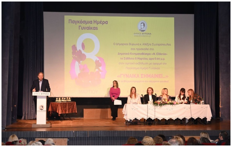 Με μεγάλη επιτυχία το Σάββατο 8 Μαρτίου 2025, Παγκόσμια Ημέρα Γυναίκας, στο Δημοτικό Κινηματογράφο «Νέα Ελβετία», ο Δήμος Βύρωνα με μια σεμνή αλλά ουσιαστική εκδήλωση με τίτλο: «ΓΥΝΑΙΚΑ ΣΗΜΑΙΝΕΙ…Με το βλέμμα στραμμένο στη σύγχρονη γυναίκα!» τίμησε την γυναίκα.
