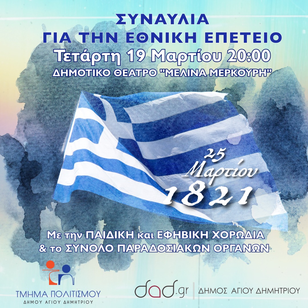 Με αφορμή την Εθνική Επέτειο της 25ης Μαρτίου, που αναμένεται να εορτασθεί την επόμενη εβδομάδα, ο Δήμος Αγίου Δημητρίου διοργανώνει μία συναυλία με την παιδική και εφηβική Χορωδία καθώς και το σύνολο Παραδοσιακών Οργάνων του Δημοτικού Ωδείου.