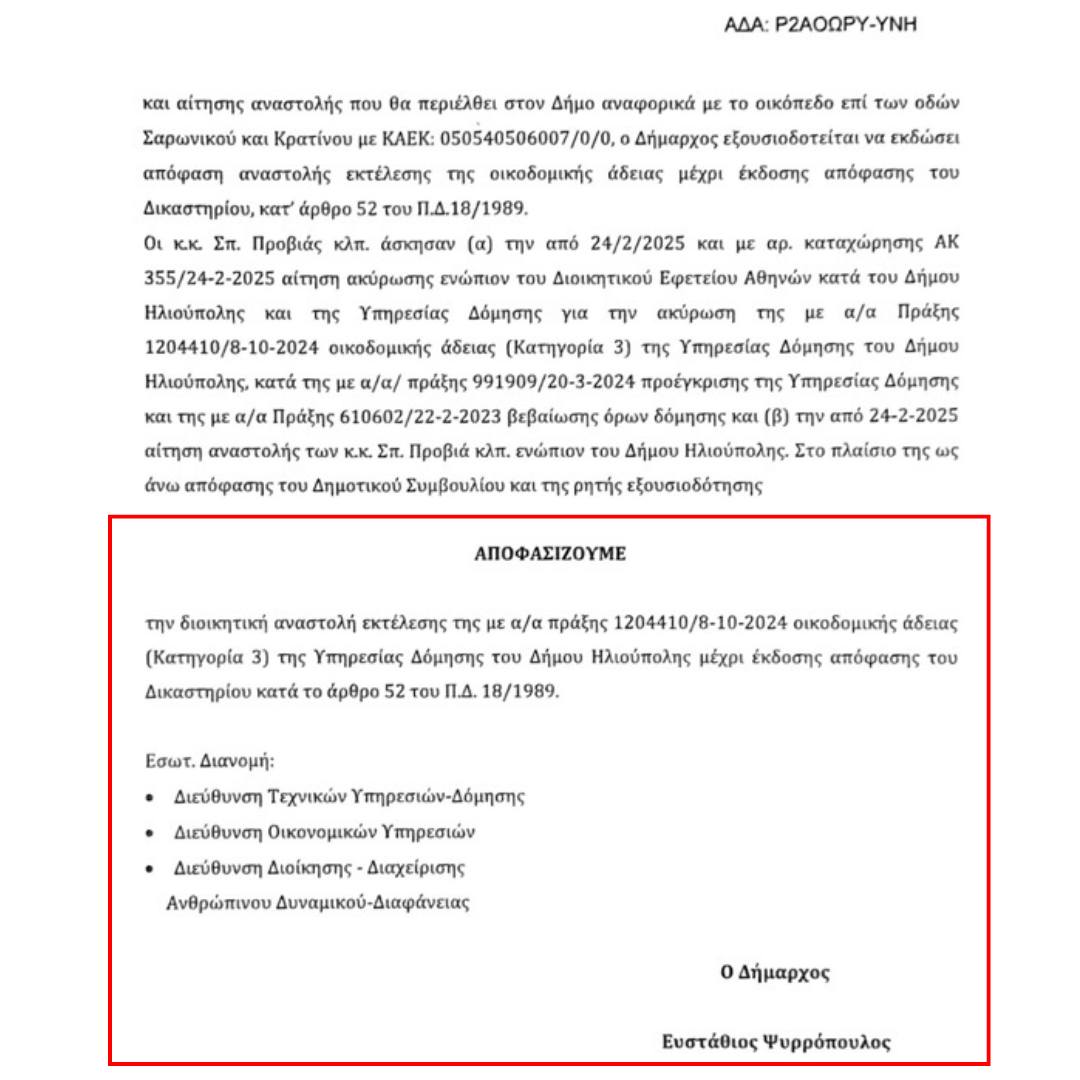Δυνάμει της με αριθμόν 2/10-1-2025 απόφασης του Δημοτικού Συμβουλίου αποφασίστηκε με δική μου πρωτοβουλία και εισήγηση, όπως θα διαπιστώσετε από τα επισυναπτόμενα έγγραφα που το πιστοποιούν ότι επί οποιασδήποτε αίτησης ακύρωσης κατοίκου ή κατοίκων και αίτησης αναστολής που θα περιέλθει στο Δήμο αναφορικά με το οικόπεδο επί της οδού Σαρωνικού και Κρατίνου, να εξουσιοδοτηθώ προκειμένου να προβώ στην έκδοση απόφασης αναστολής εκτέλεσης της οικοδομικής άδειας, μέχρι εκδόσεως απόφασης του δικαστηρίου.
