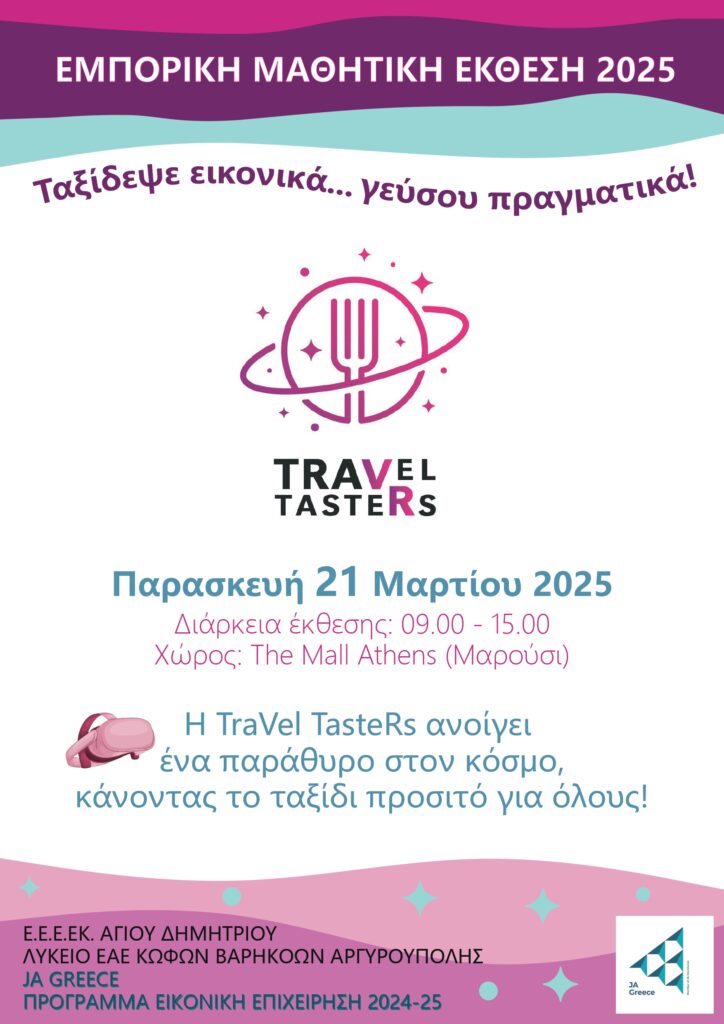 Η εικονική μαθητική επιχείρηση «TraVel TasteRs, Ταξίδεψε Εικονικά…Γεύσου Πραγματικά» φέρνει μια νέα διάσταση στον τρόπο που βιώνουμε τον κόσμο, προσφέροντας μοναδικές ταξιδιωτικές εμπειρίες σε άτομα που αδυνατούν να μετακινηθούν. Με τη χρήση τεχνολογίας εικονικής πραγματικότητας (VR) και αυθεντικών γευστικών εμπειριών απ’ όλο τον κόσμο οι “ταξιδιώτες μπορούν να εξερευνήσουν πολιτισμούς, τοπία και κουζίνες από την άνεση του χώρου τους”.