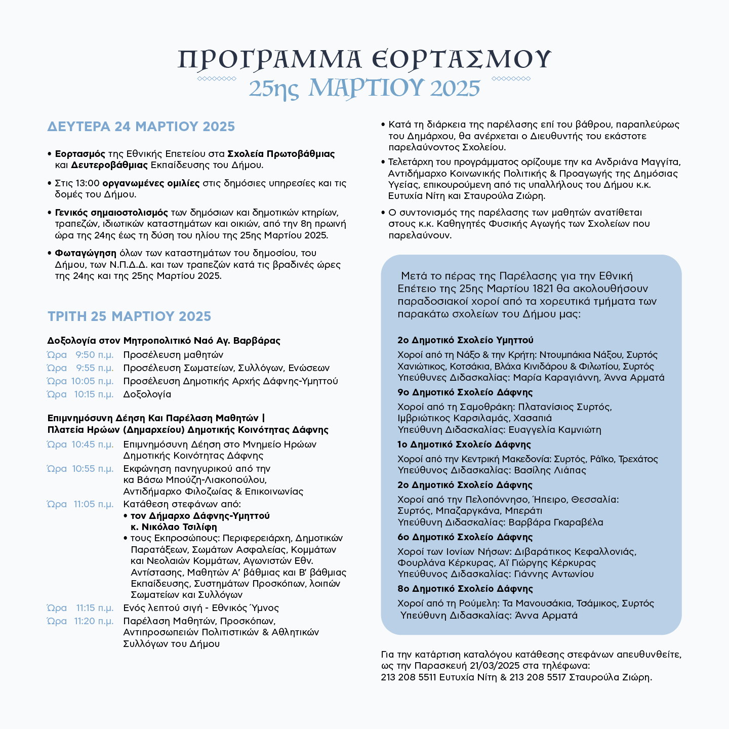 Οι εκδηλώσεις θα πραγματοποιηθούν την Τρίτη 25 Μαρτίου 2025, σύμφωνα με το παρακάτω πρόγραμμα:
