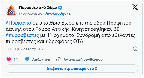 «Σε εξέλιξη πυρκαγιά στον Ταύρο Αττικής. Οι καπνοί κατευθύνονται στην περιοχή σας. Παραμείνετε σε εσωτερικούς χώρους, κλείστε πόρτες και παράθυρα. Ακολουθείτε τις οδηγίες των Αρχών».