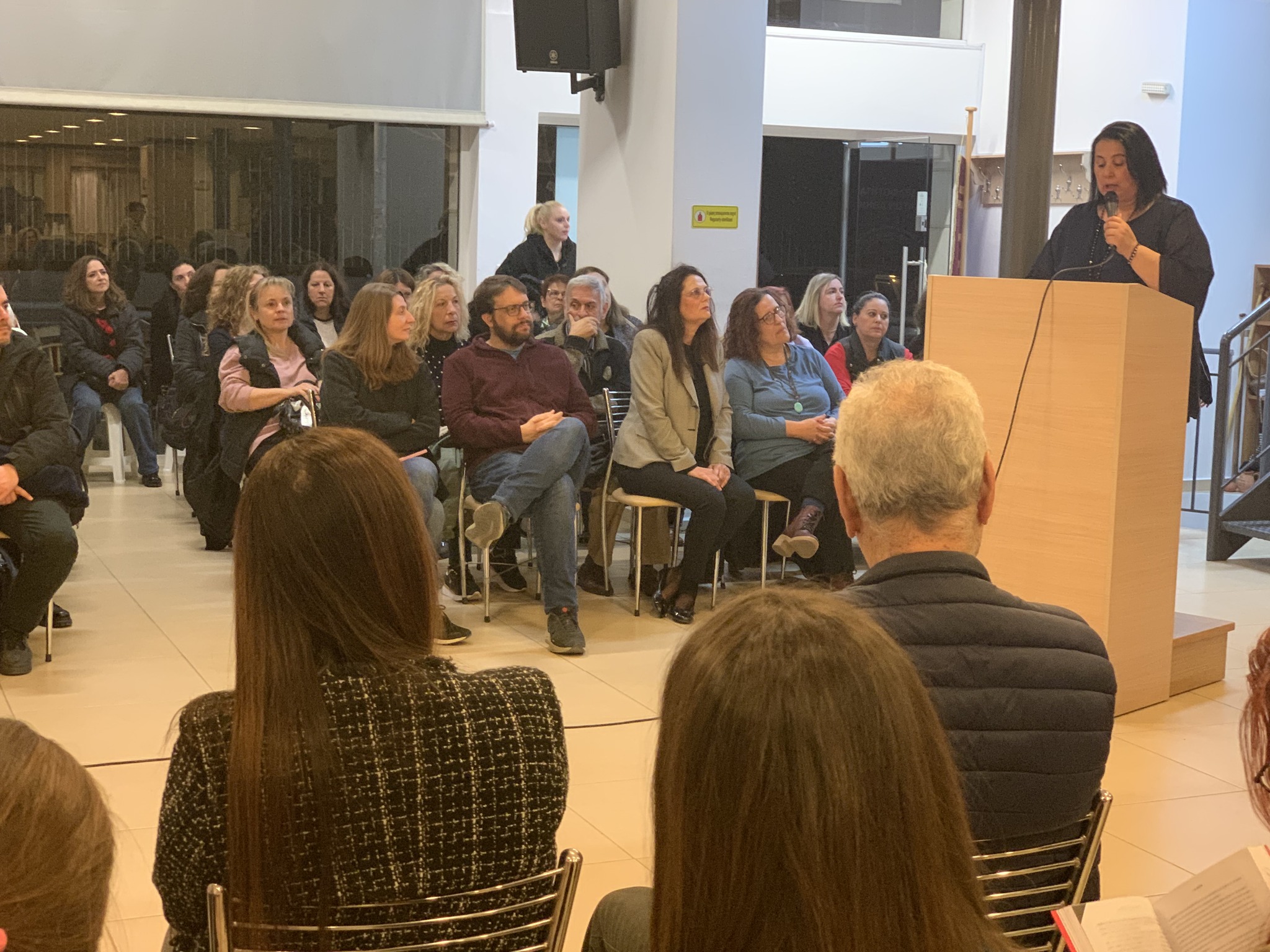 Στο σημείο αυτό η κα Βασιλική Βαζαίου πρόεδρος της Επιτροπής Ισότητας του δήμου Αγίου Δημητρίου, στον χαιρετισμό της, συνηγόρησε για το φαινόμενο της έμφυλης βίας στην πόλη.