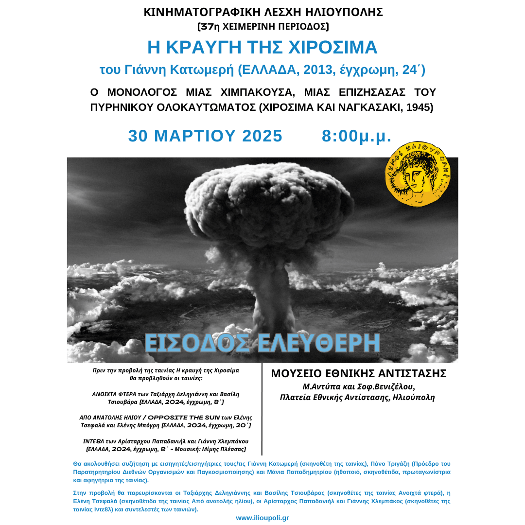 Η Κινηματογραφική Λέσχη Ηλιούπολης προσκαλεί όλους τους λάτρεις της έβδομης τέχνης στην προβολή της ταινίας «H κραυγή της Χιροσίμα», του Γιάννη Κατωμερή.