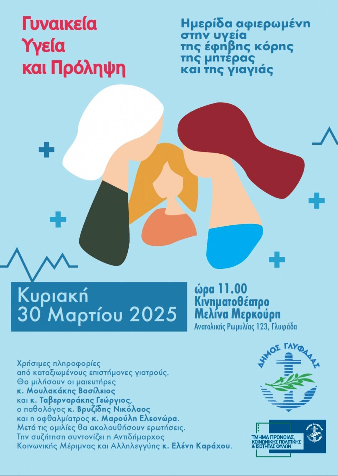 Πριν από το τέλος του Μαρτίου, που είναι μήνας αφιερωμένος στη Γυναίκα, με αφορμή και την Παγκόσμια Ημέρα που εορτάστηκε πρόσφατα, ο Δήμος Γλυφάδας (Τμήμα Πρόνοιας, Κοινωνικής Πολιτικής και Ισότητας των Φύλων) διοργανώνει μία ενημερωτική ημερίδα για την Υγεία της Γυναίκας και την αξία της Πρόληψης.