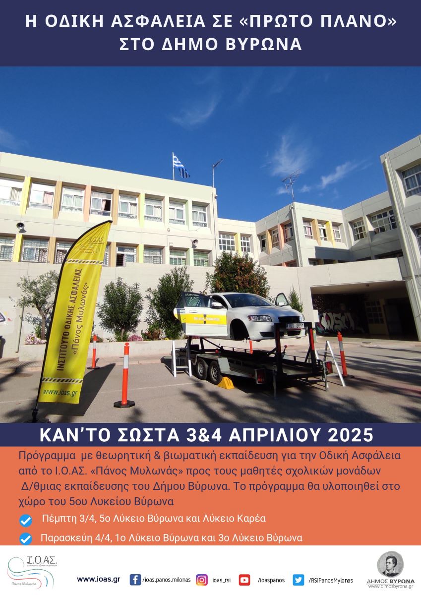 Στις 3 & 4 Απριλίου 2025, θα πραγματοποιηθεί το εκπαιδευτικό πρόγραμμα οδικής ασφάλειας «Καν’ το Σωστά», από το τμήμα Παιδείας του Δήμου Βύρωνα σε συνεργασία με το Ινστιτούτο Οδικής Ασφάλειας «Πάνος Μυλωνάς».