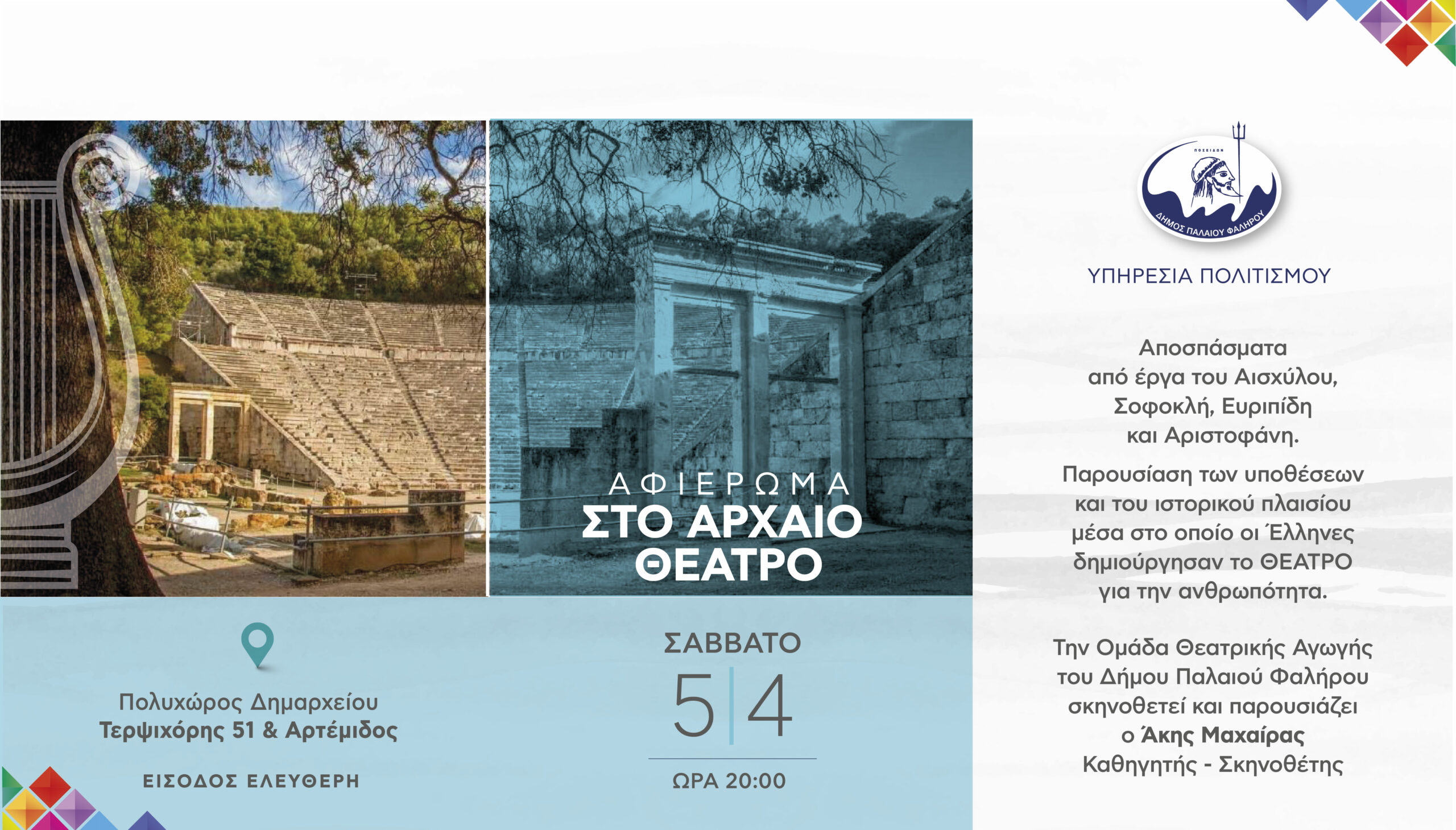 Ο Δήμος Παλαιού Φαλήρου και η Υπηρεσία Πολιτισμού προσκαλούν όλους τους δημότες σε μοναδικό αφιέρωμα στο Αρχαίο Θέατρο.