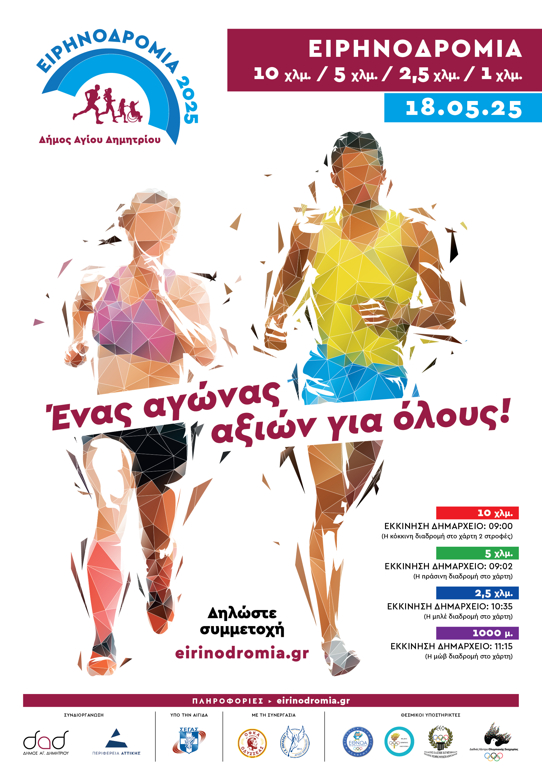 Συνεχίζονται με εντατικούς ρυθμούς οι προετοιμασίες για την «Ειρηνοδρομία 2025», η οποία θα διεξαχθεί την Κυριακή 18 Μαΐου και αποτελεί την καρδιά του δρομικού κινήματος στον Άγιο Δημήτριο Αττικής.