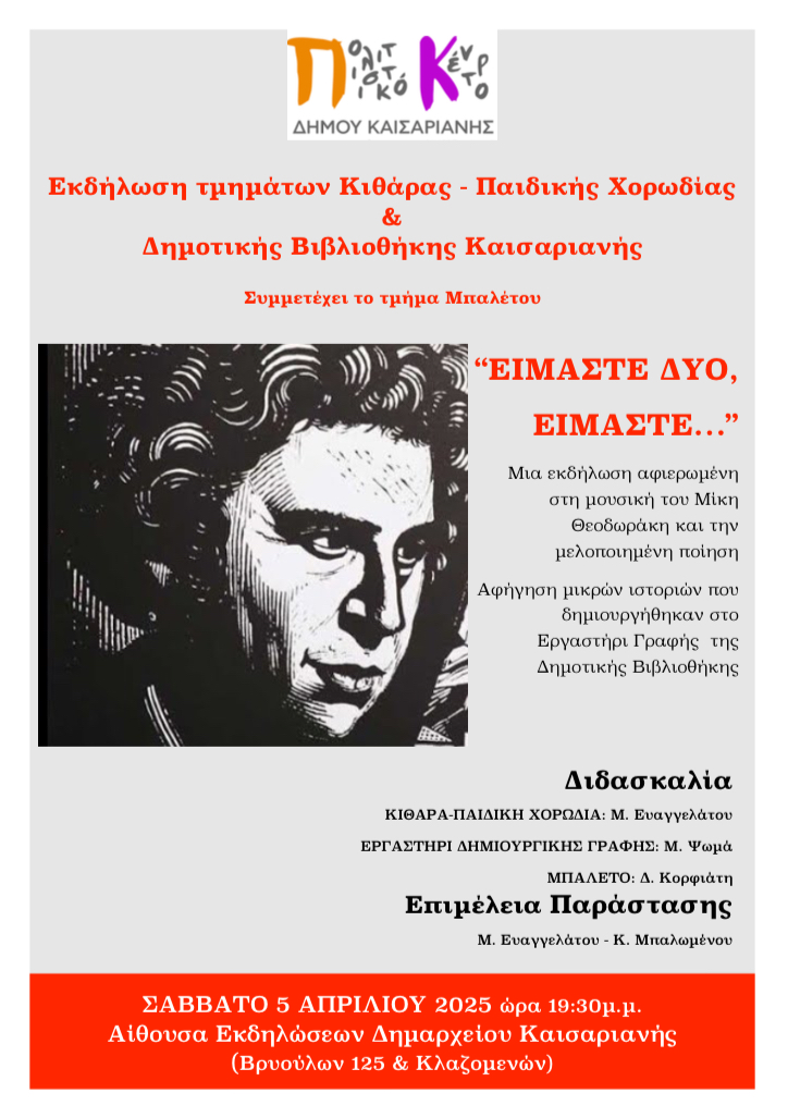 Μία εκδήλωση αφιερωμένη στη μουσική του Μίκη Θεοδωράκη και στη μελοποιημένη ποίηση με τίτλο: «Είμαστε δύο, είμαστε…», διοργανώνουν τα Τμήματα Κιθάρας – Παιδικής Χορωδίας του Πολιτιστικού Κέντρου και η Δημοτική Βιβλιοθήκη της Καισαριανής.