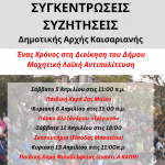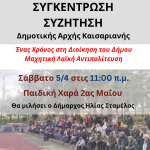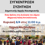 Με αφορμή τη συμπλήρωση ενός έτους από την ανάληψη της διοίκησης, η Δημοτική Αρχή της Καισαριανής, οργανώνει ανοιχτές συγκεντρώσεις στις γειτονιές και σε διάφορα σημεία της πόλης.