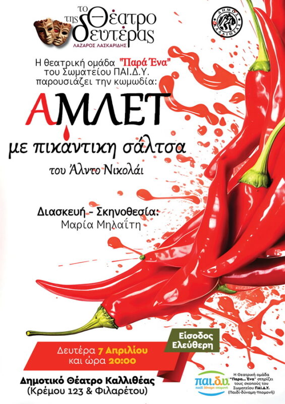 Η θεατρική ομάδα “Παρά…Ένα” του σωματείου ΠΑΙ.Δ.Υ. – Παιδί -Δύναμη -Υπομονή, παρουσιάζει την θεατρική παράσταση: «Άμλετ με πικάντικη σάλτσα» του Άλντο Νικολάι, σε σκηνοθεσία της Μαρίας Μηλαΐτη.