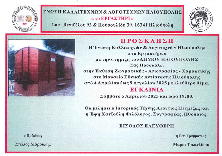 Η Ένωση Καλλιτεχνών & Λογοτεχνών Ηλιούπολης «Το Εργαστήρι» με την υποστήριξη του Δήμου Ηλιούπολης διοργανώνει Έκθεση ζωγραφικής, αγιογραφίας και χαρακτικής με ελεύθερο θέμα, στο Μουσείο Εθνικής Αντίστασης.