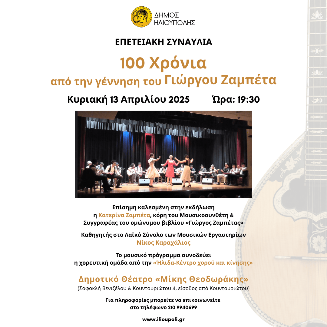 Με αφορμή τα 100 χρόνια από τη γέννηση του Γιώργου Ζαμπέτα, το Λαϊκό Σύνολο των Μουσικών Εργαστηρίων του Δήμου Ηλιούπολης, με καθηγητή τον Νίκο Καραχάλιο, παρουσιάζει μια αφιερωμένη μουσικοχορευτική παράσταση με αγαπημένα τραγούδια και σκοπούς του μεγάλου συνθέτη.