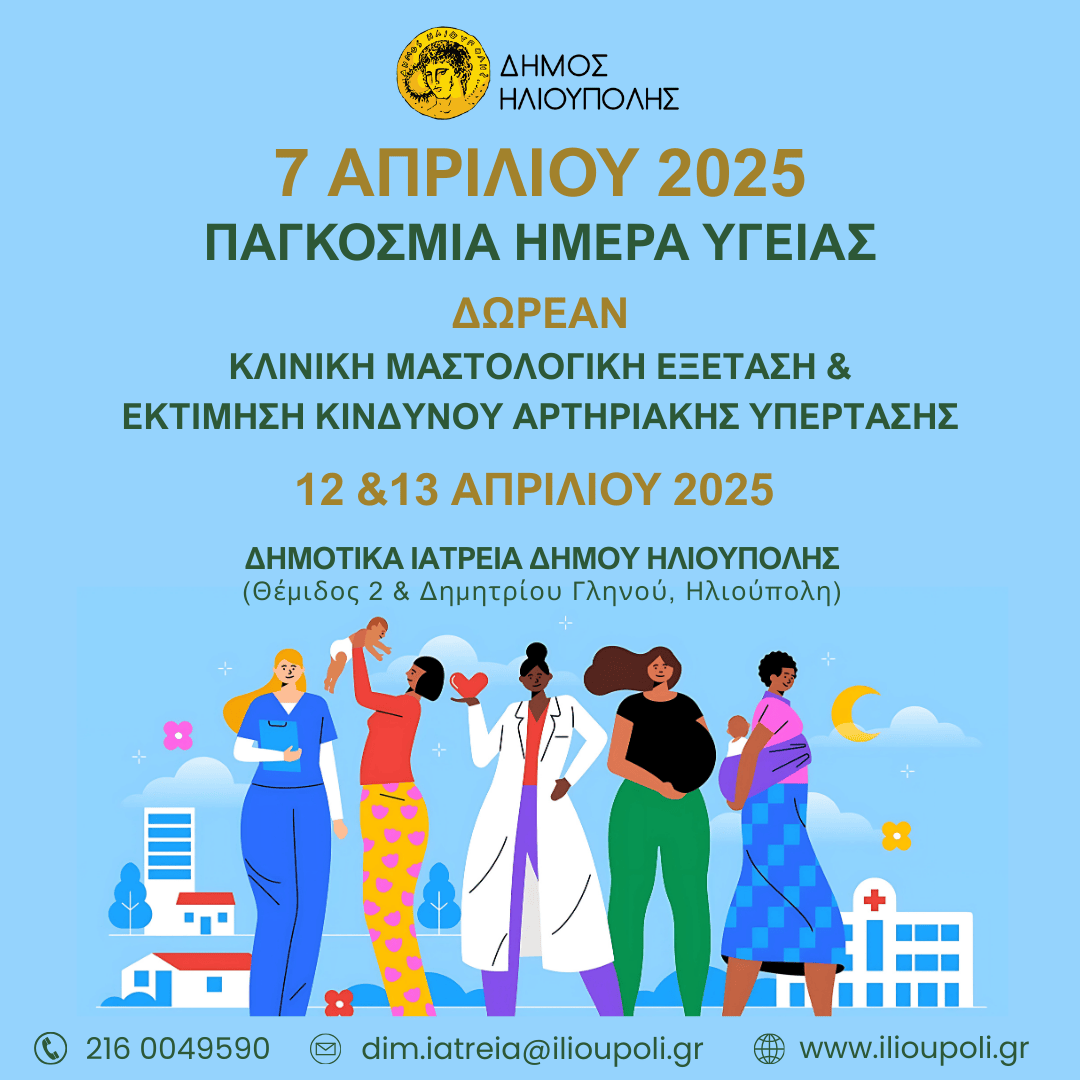 Με αφορμή την Παγκόσμια Ημέρα Υγείας, που εορτάζεται κάθε χρόνο στις 7 Απριλίου 2025, ο Δήμος Ηλιούπολης παρέχει σε όλες τις γυναίκες που το επιθυμούν δωρεάν κλινική μαστολογική εξέταση στα Δημοτικά Ιατρεία του Δήμου Ηλιούπολης.