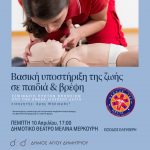 Ένα σεμινάριο πρώτων βοηθειών με θέμα: «Βασική υποστήριξη της ζωής σε παιδιά και βρέφη» διοργανώνει η Διεύθυνση Παιδείας του δήμου Αγίου Δημητρίου, την Πέμπτη 10 Απριλίου και ώρα 17:00, στο Δημοτικό Θέατρο «Μελίνα Μερκούρη».