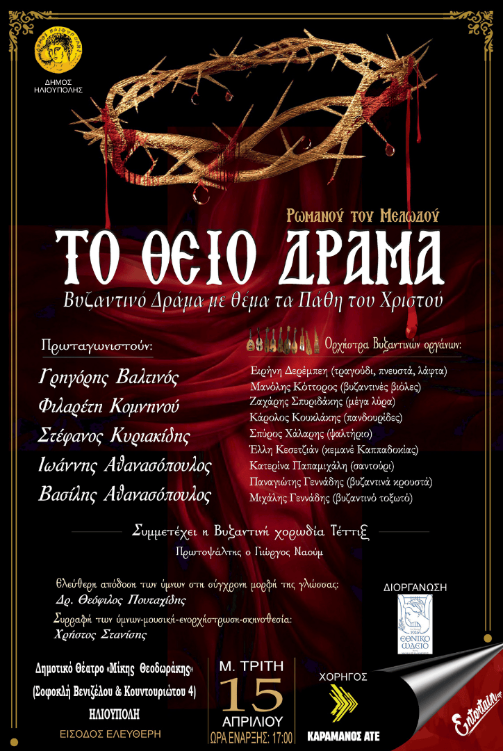 «Το Θείο Δράμα», το βυζαντινό δράμα με θέμα τα πάθη του Χριστού, βασισμένο στους ύμνους του Ρωμανού του Μελωδού, σε μορφή ορατορίου, θα φιλοξενηθεί δωρεάν σε διοργάνωση του Εθνικού Ωδείου Ηλιούπολης, με την υποστήριξη του Δήμου Ηλιούπολης.