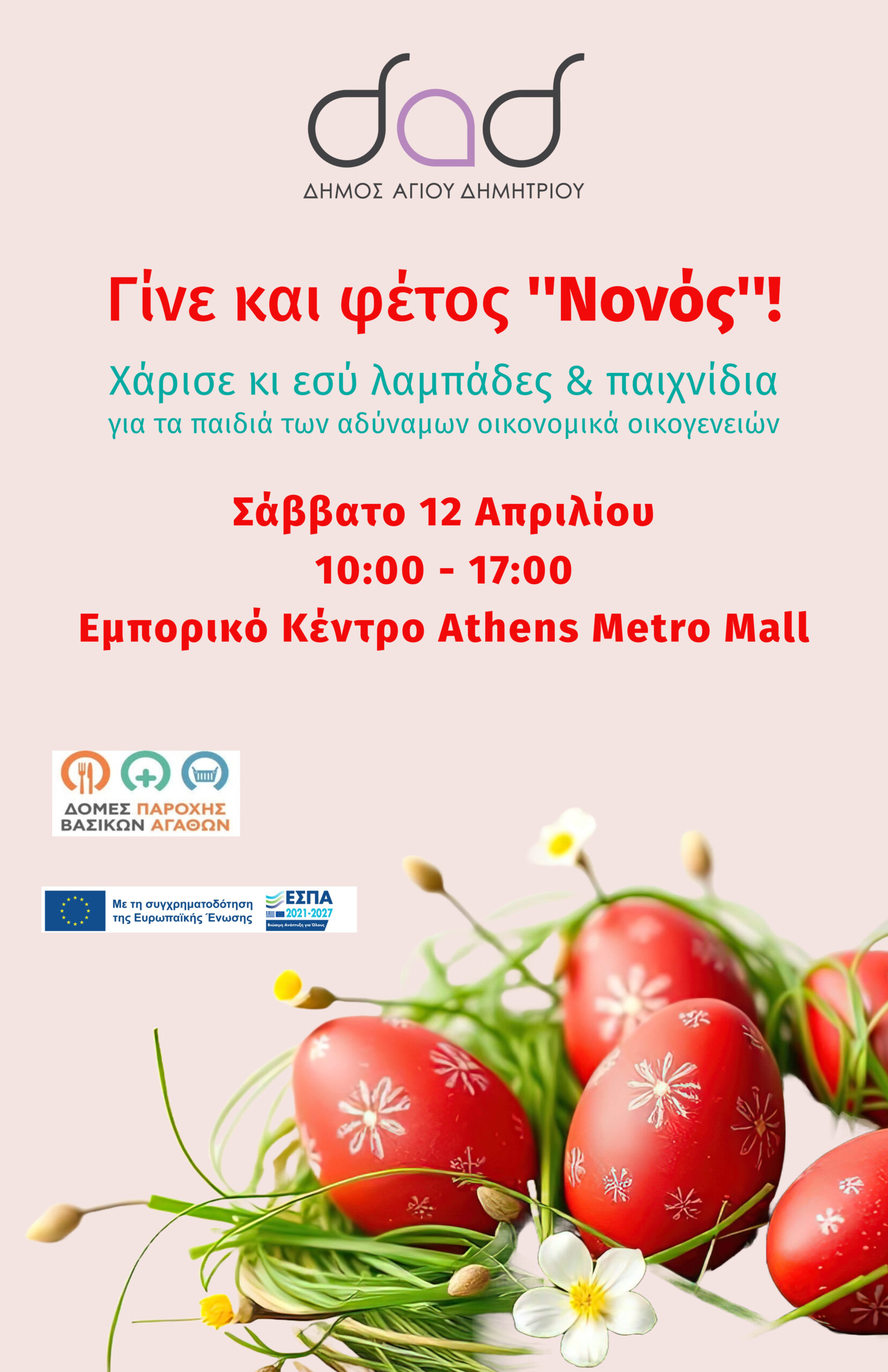 Μία πασχαλινή δράση αγάπης και αλληλεγγύης οργανώνει φέτος το Πάσχα το Τμήμα Υγείας και Πρόνοιας και οι Δομές Παροχής Βασικών Αγαθών του Δήμου Αγίου Δημητρίου.